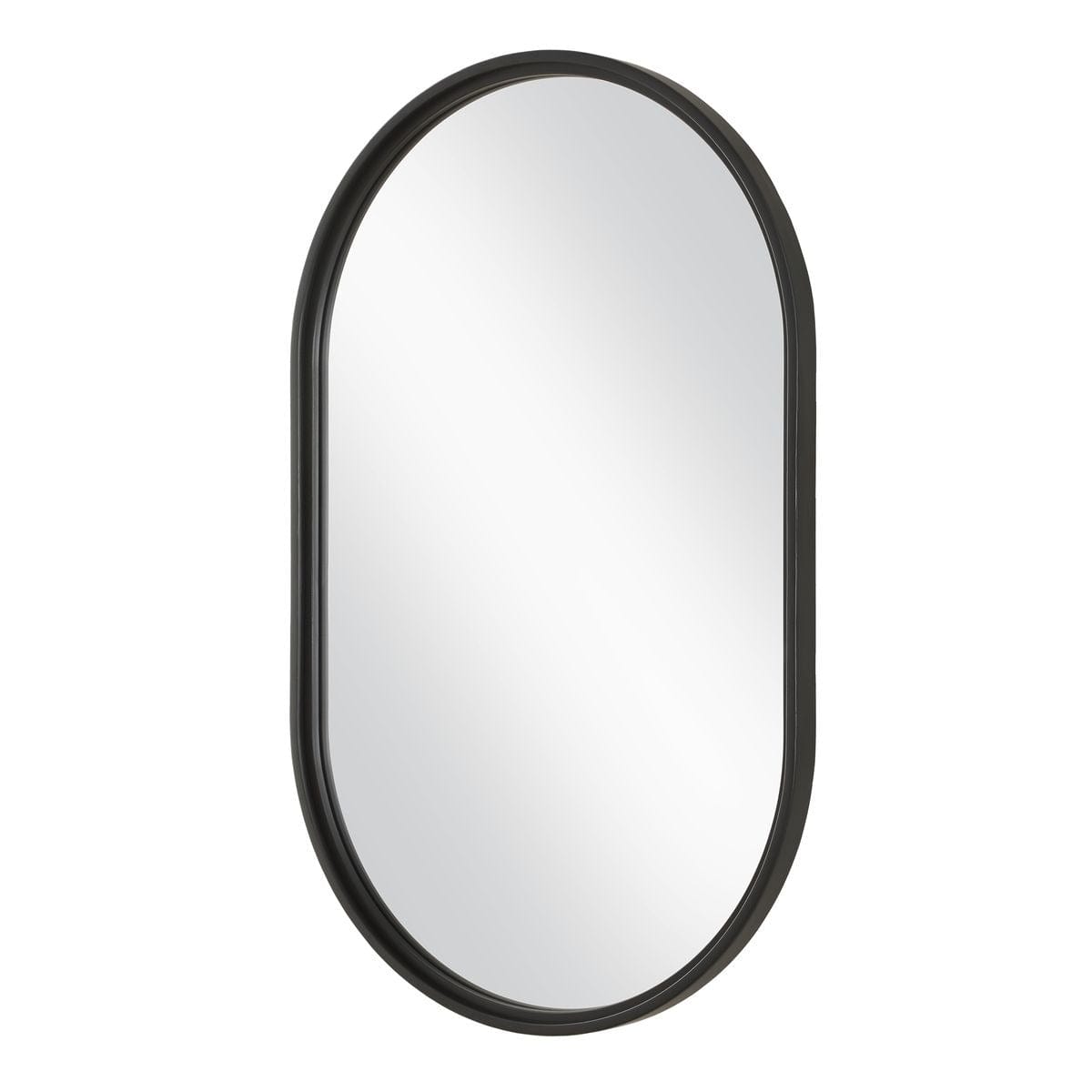 Black Pill MirrorEncased in a durable iron frame, this pill shaped mirror features a unique step-down profile, creating visual depth. The satin black finish adds a more modern touch to this simple design. May be hung either vertically or horizontally.
