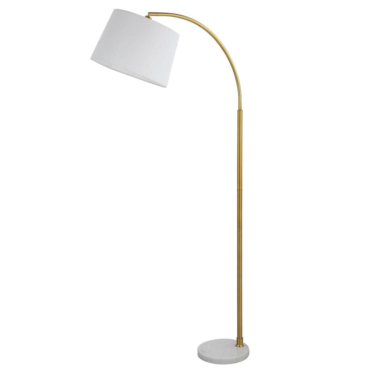 This contemporary style metal arc floor lamp is finished in gold, and is anchored with a thick white marble base. The tapered white linen shade can be adjusted to shine light where needed.