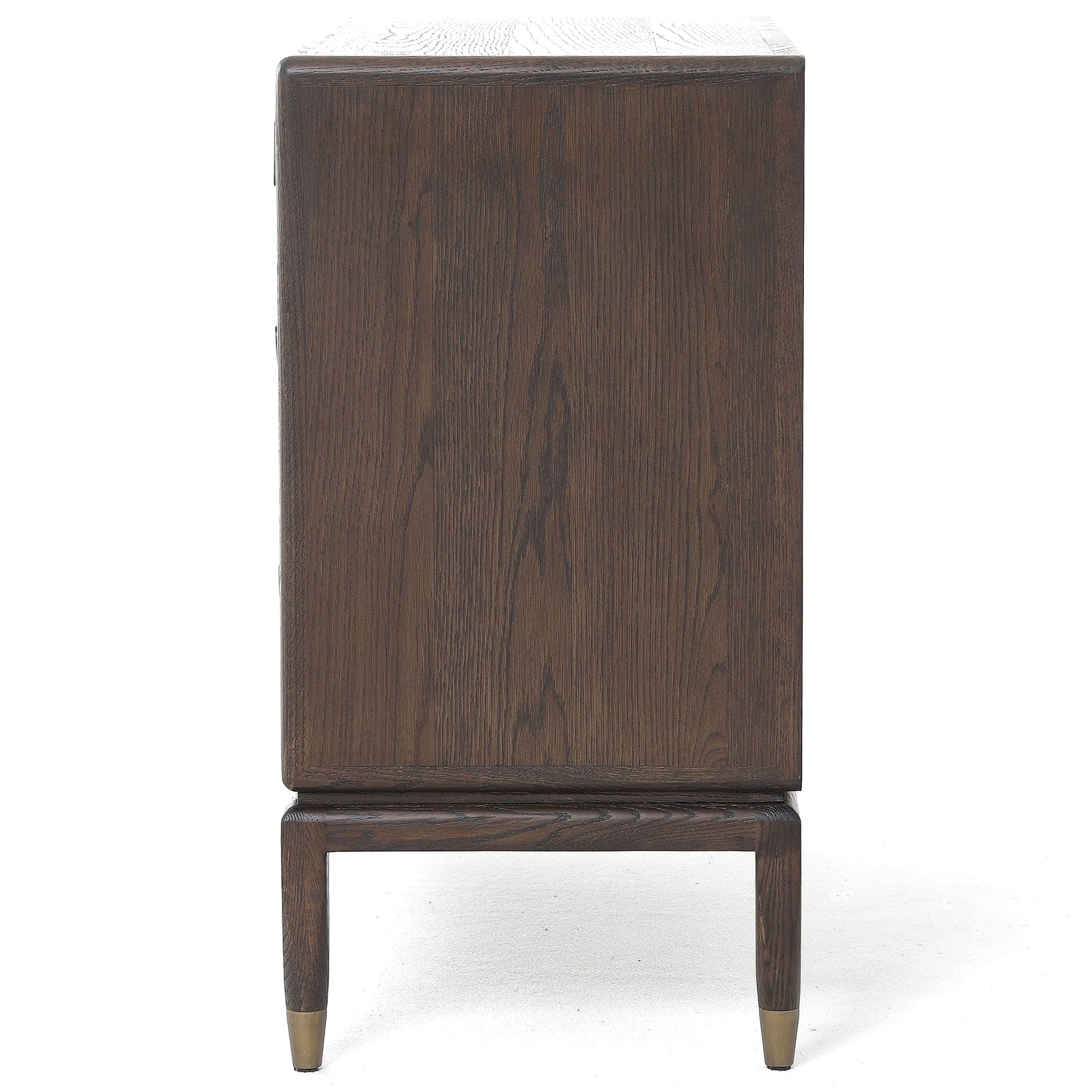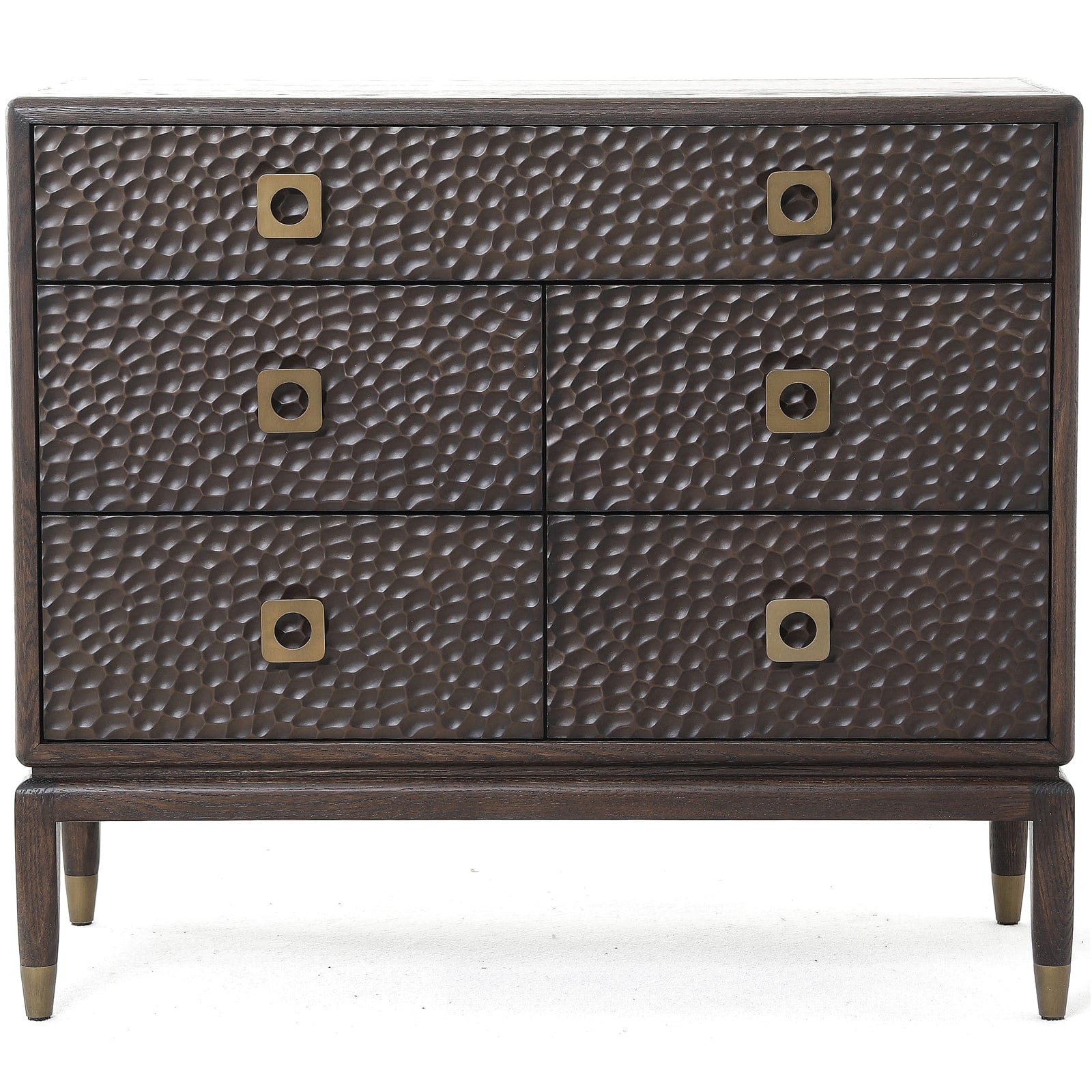 Keiichi Honeybourne Small Chest of DrawersThe Keiichi Honeybourne Small Chest of Drawers boasts five drawers to provide an abundance of storage options for any bedroom. Soft closing drawers have been finished in a dark hammered oak veneer with antiqued brass holed handles. The curved edges case the piece smoothly, and brass capped legs elevate the Honeybourne small chest of drawers making it a luxurious choice for any bedroom or dressing area. KeiichiKeiichi delivers high-style furniture designed for contemporary living. From modern counter stools to stylish dining chairs, the Keiichi furniture collection features on-trend pieces that will elevate any interior space. Designer armchairs and accent chairs are upholstered in sumptuous fabrics including boucle and sheepskin, in relaxed designs that blend seamlessly into modern living spaces. Keiichi’s stylish selection of fashion-forward products combine quality craftsmanship with flair for every room of the home.