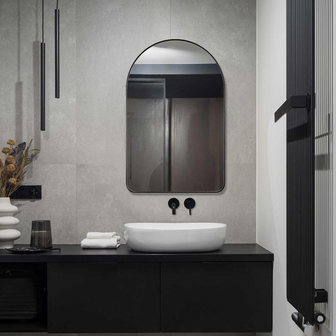 This updated arch top features a satin black iron frame which encases a floating mirror. The simplistic look makes this frame an easy choice when finishing your master bath or over a console table in the foyer to welcome guests.