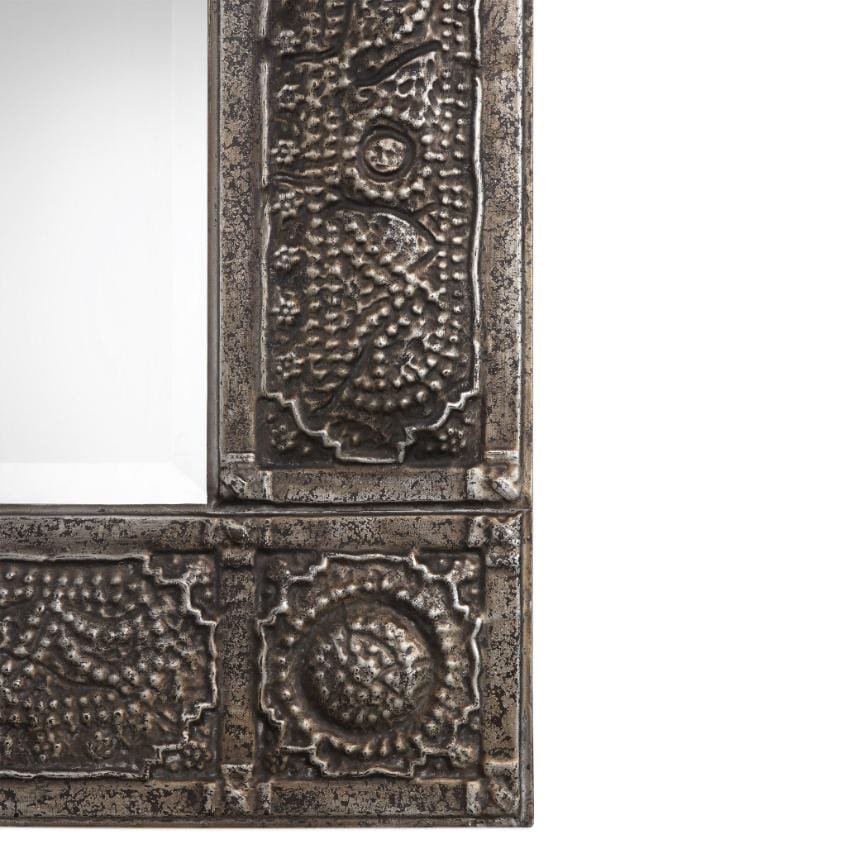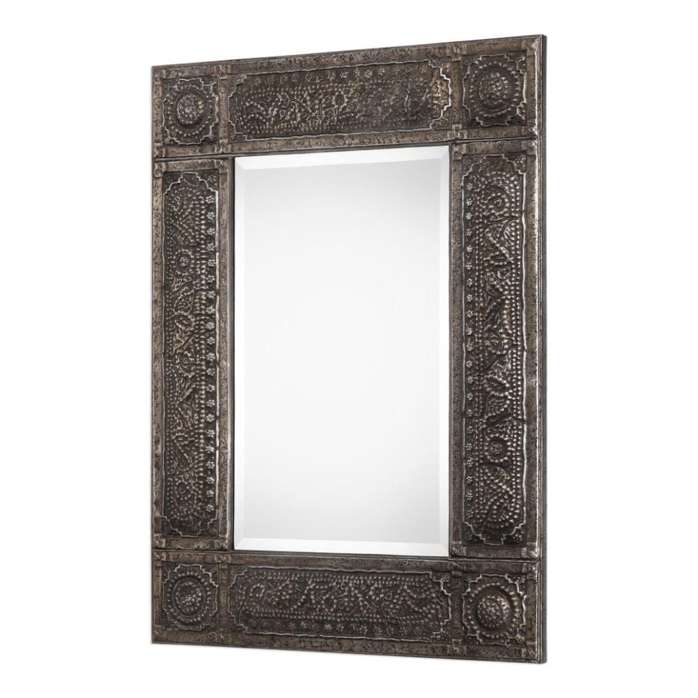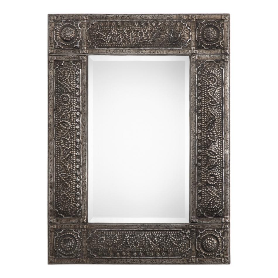 This embossed metal frame is finished in a heavily antiqued rust gray wash with silver undertones and black distressing. The mirror has a generous 1.25" bevel. May be hung either vertically or horizontally.