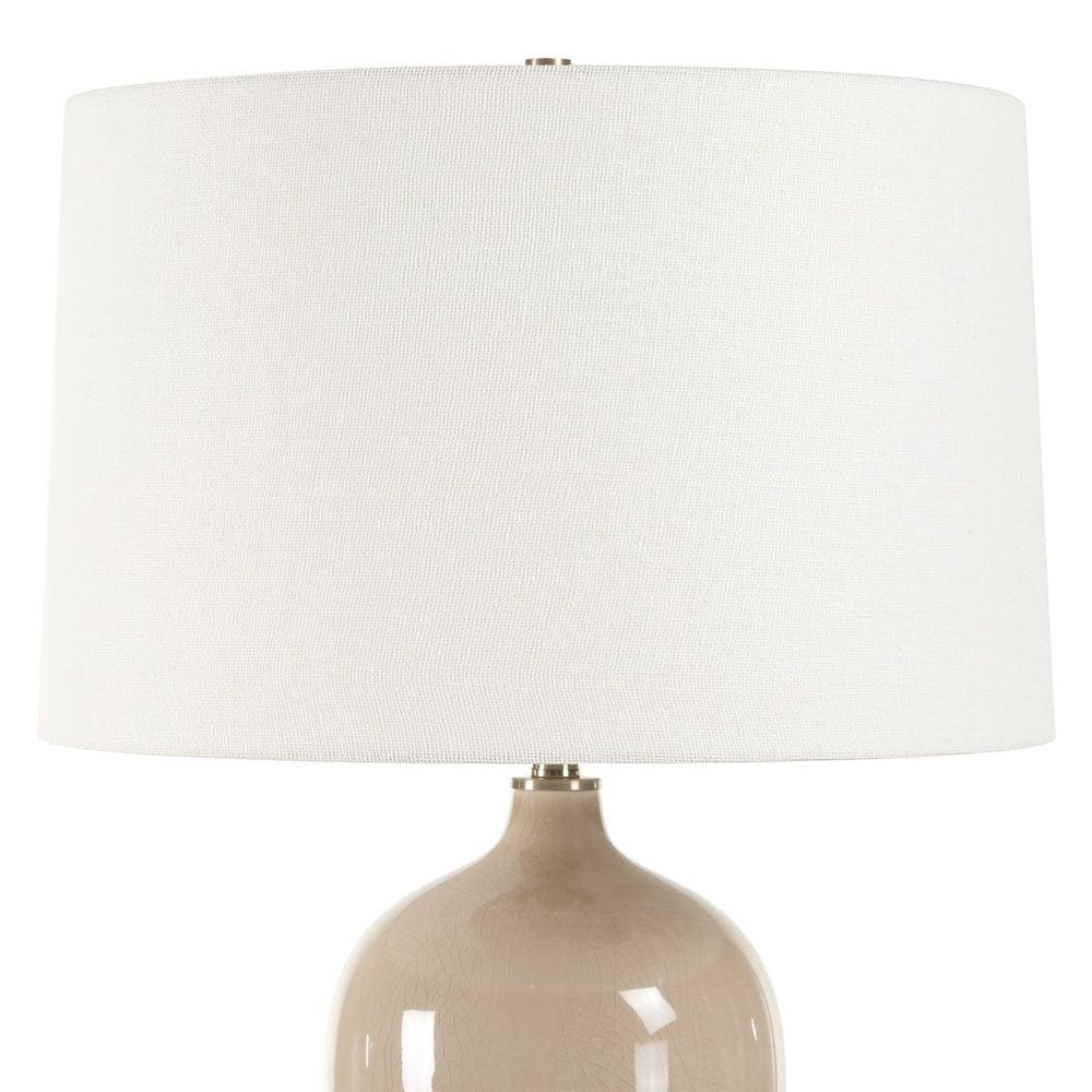 A perfect blend of contemporary style and timeless charm, this ceramic lamp is finished in a crackled light sandy gray glaze, with the delicate crackle effect adding a touch of artisanal craftsmanship. Antique brushed brass accents complement the beautiful finish. This elegantly simple silhouette is topped with a slightly tapered shade in an off-white linen fabric.KeiichiKeiichi delivers high-style furniture designed for contemporary living. From modern counter stools to stylish dining chairs, the Keiichi furniture collection features on-trend pieces that will elevate any interior space. Designer armchairs and accent chairs are upholstered in sumptuous fabrics including boucle and sheepskin, in relaxed designs that blend seamlessly into modern living spaces. Keiichi’s stylish selection of fashion-forward products combine quality craftsmanship with flair for every room of the home.
