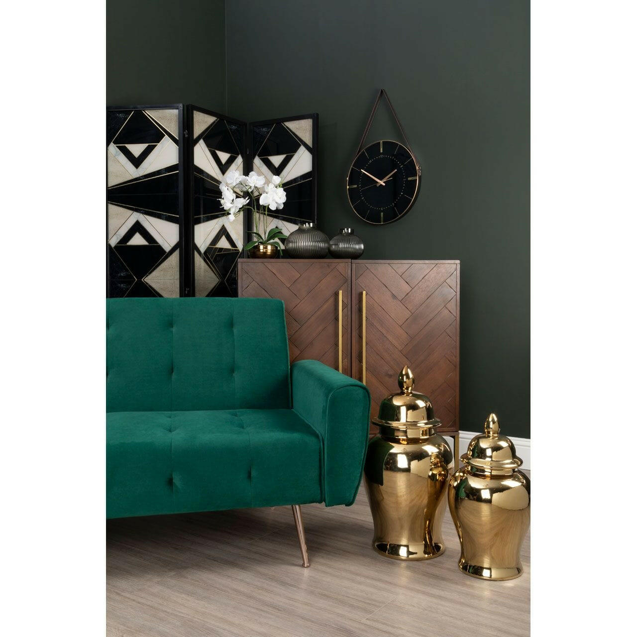 This exquisitely shaped jar is made from smooth ceramic and has a gold colour for a reflective finish. It features many of the classic hallmarks associated with the traditional ginger jar, including high shoulders, a rounded shape, and a domed lid. The lid boasts a final-style handle that corresponds with the curves of the jar's body.