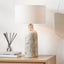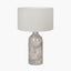 A stunning stoneware table lamp finished with a truly astonishing marble effect. Ribbed with delicate flashes of gold leaf this bottle-shaped lamp looks fabulous with the luxurious, heavy-weight, open weave, white cotton cylinder lamp shade.