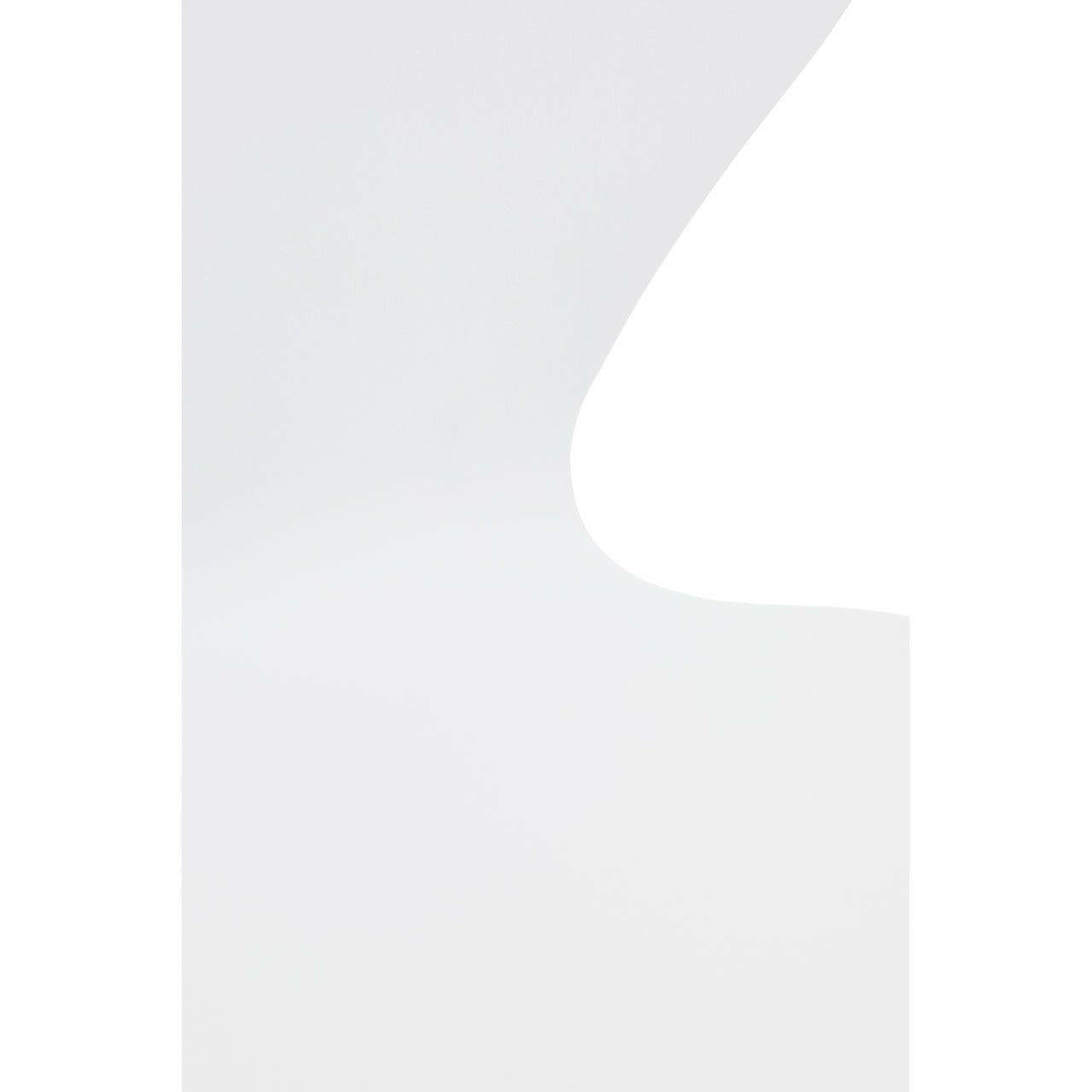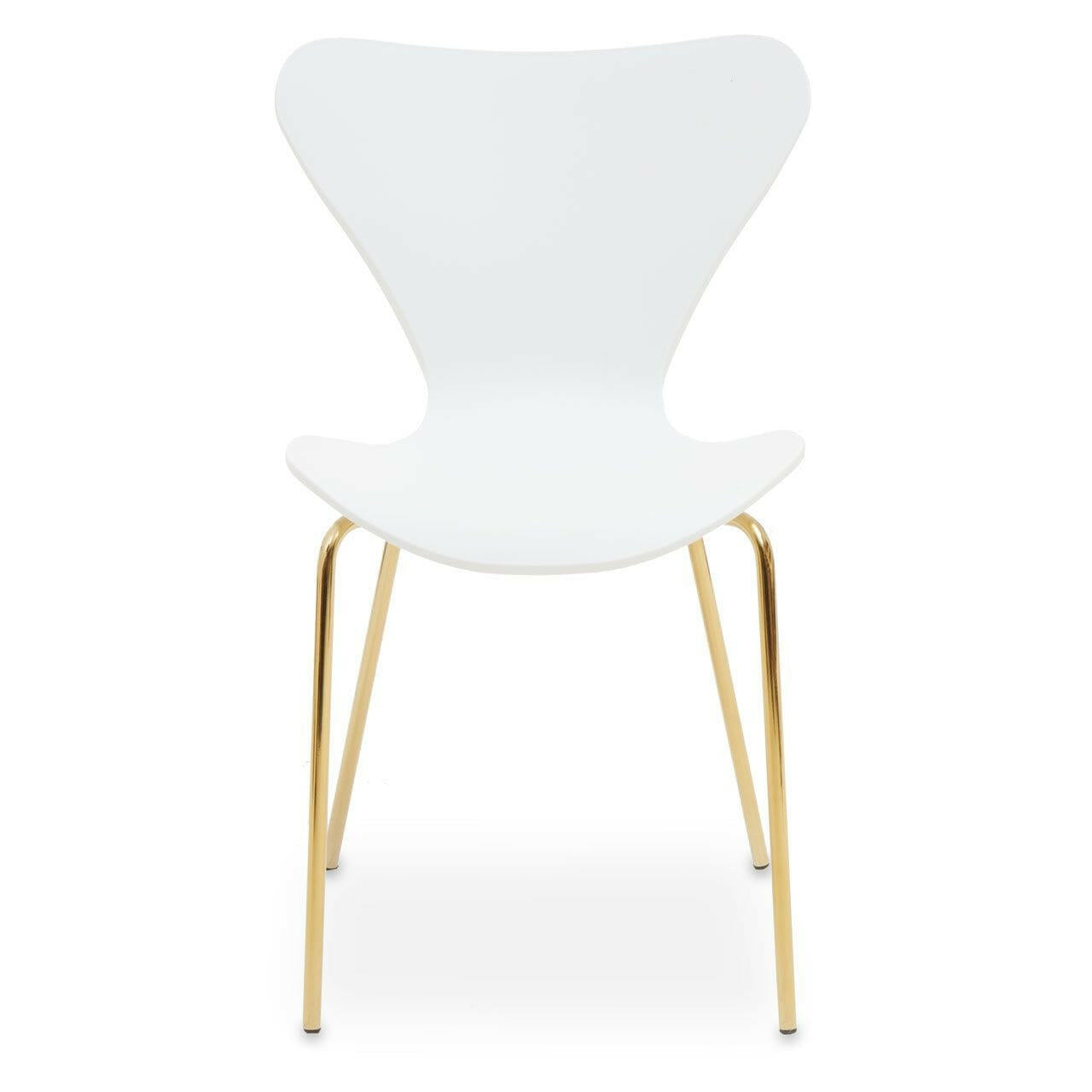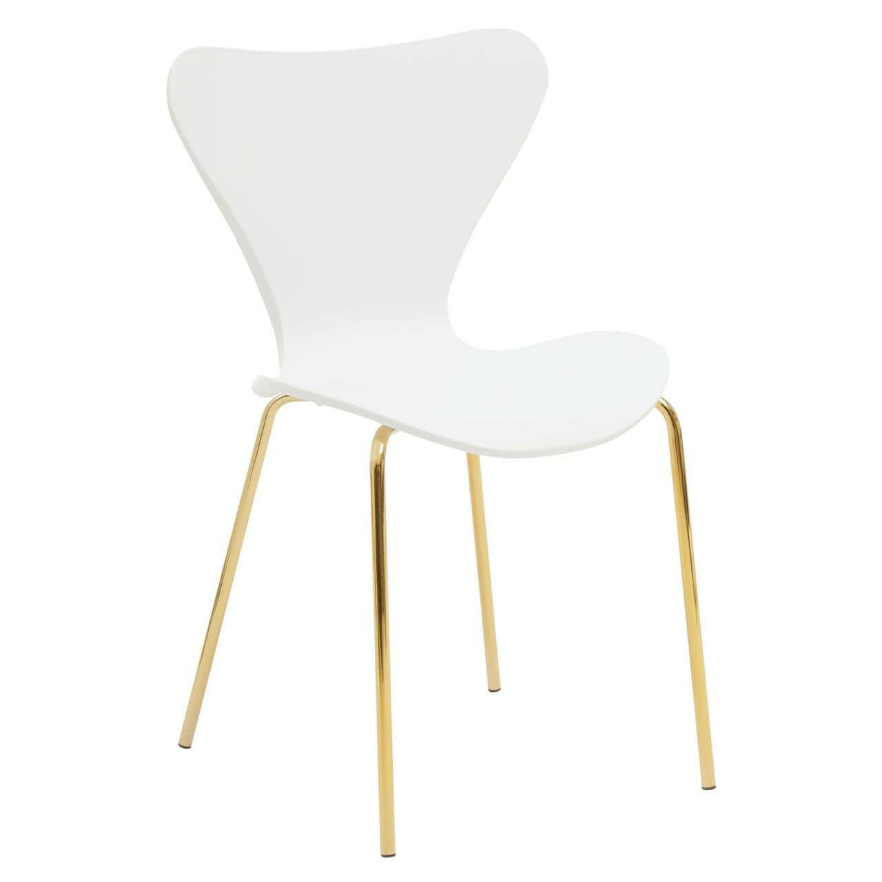 This chair has a white undulating seat that matches the tapered back. Gold finish angular legs creates a linear juxtaposition with the elegant curves of the design and enhance luxe appeal.