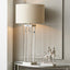 Channel the hotel vibe with this gorgeous polished silver table lamp base. The base, contemporary in style with a 4 post column design is coupled with a grey cylinder lamp shade, in an open weave linen. This is a table lamp that is sure to make an elegant statement.