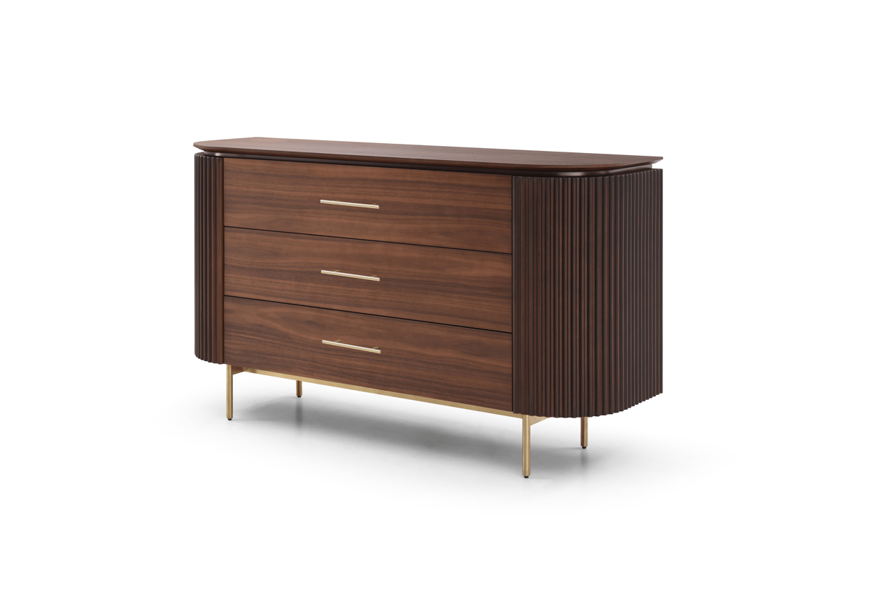 The Lantine 3-Drawer Dresser in dark walnut and brass is a striking addition to any contemporary bedroom, blending timeless sophistication with modern design. Crafted from rich dark walnut, the dresser’s sleek, minimalist profile is enhanced by its distinctive ribbed end panels. Its soft-close drawers ensure effortless functionality, while the brushed brass legs provide a subtle yet luxurious contrast, elevating the piece’s aesthetic. With its handle-free design, the dresser offers a seamless and streamlined look, making it a versatile centrepiece that exudes elegance and style. A perfect choice for those seeking a blend of practicality and refined modernity.