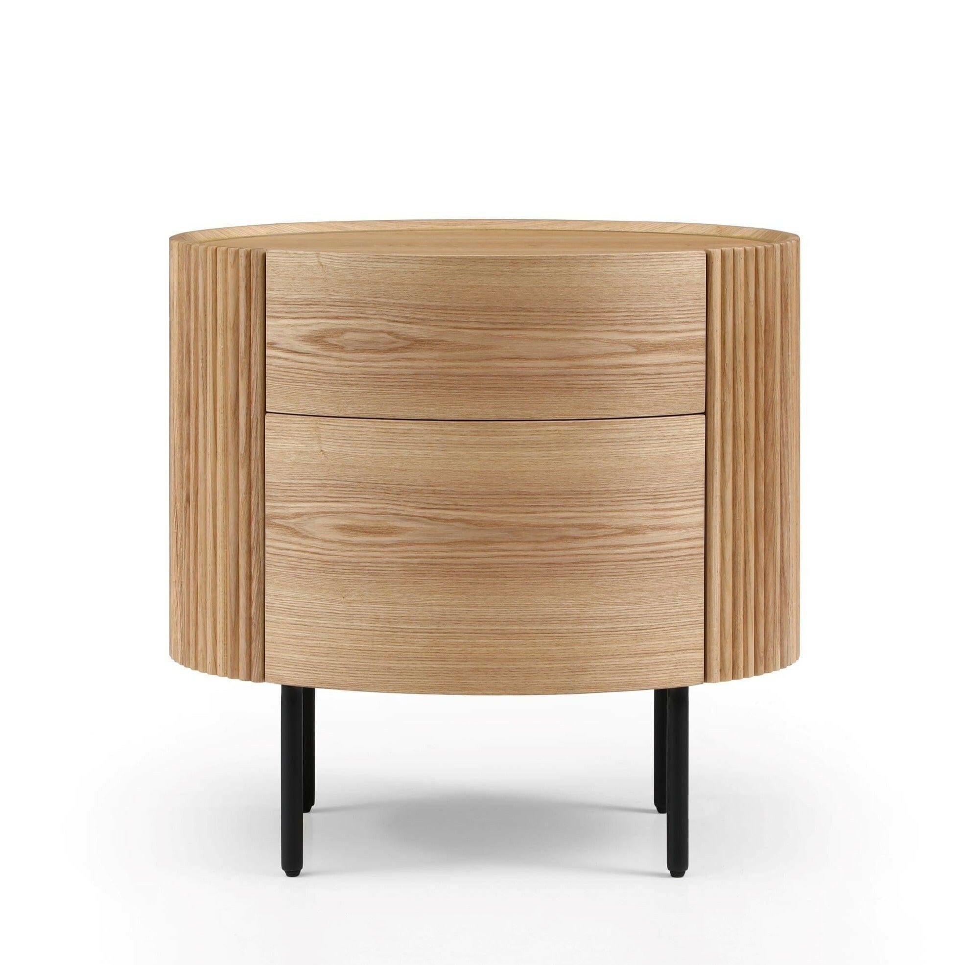 Elevate your bedroom's allure with the Lantine Bedside Table in Ash Oak—an embodiment of timeless elegance and refined style that seamlessly integrates into your space. Boasting two meticulously crafted drawers and a top and doors finished in the rich, inviting hue of ash oak, this bedside table offers a practical haven for your bedtime essentials. The ribbed end panels and sleek black legs are thoughtful details that accentuate its exquisite craftsmanship. This versatile piece transcends mere functionality, transforming any room with its sleek, contemporary design that echoes modern sensibilities. Its ample storage capacity meets your organizational needs while its minimalistic aesthetics add a touch of understated sophistication. As the Lantine Bedside Table graces your bedroom, it not only serves as a practical companion but also becomes a visual statement—a true testament to your discerning taste and appreciation for design that beautifully marries form and function.