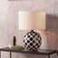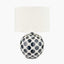 Introducing our stylish Larisa ceramic table lamp, a true statement piece. The perfectly proportioned sphere-shaped base is adorned with a contemporary monochrome spot design. Teamed with a modern style crisp white textured boucle lamp shade, which is material lined in matching cotton mix.