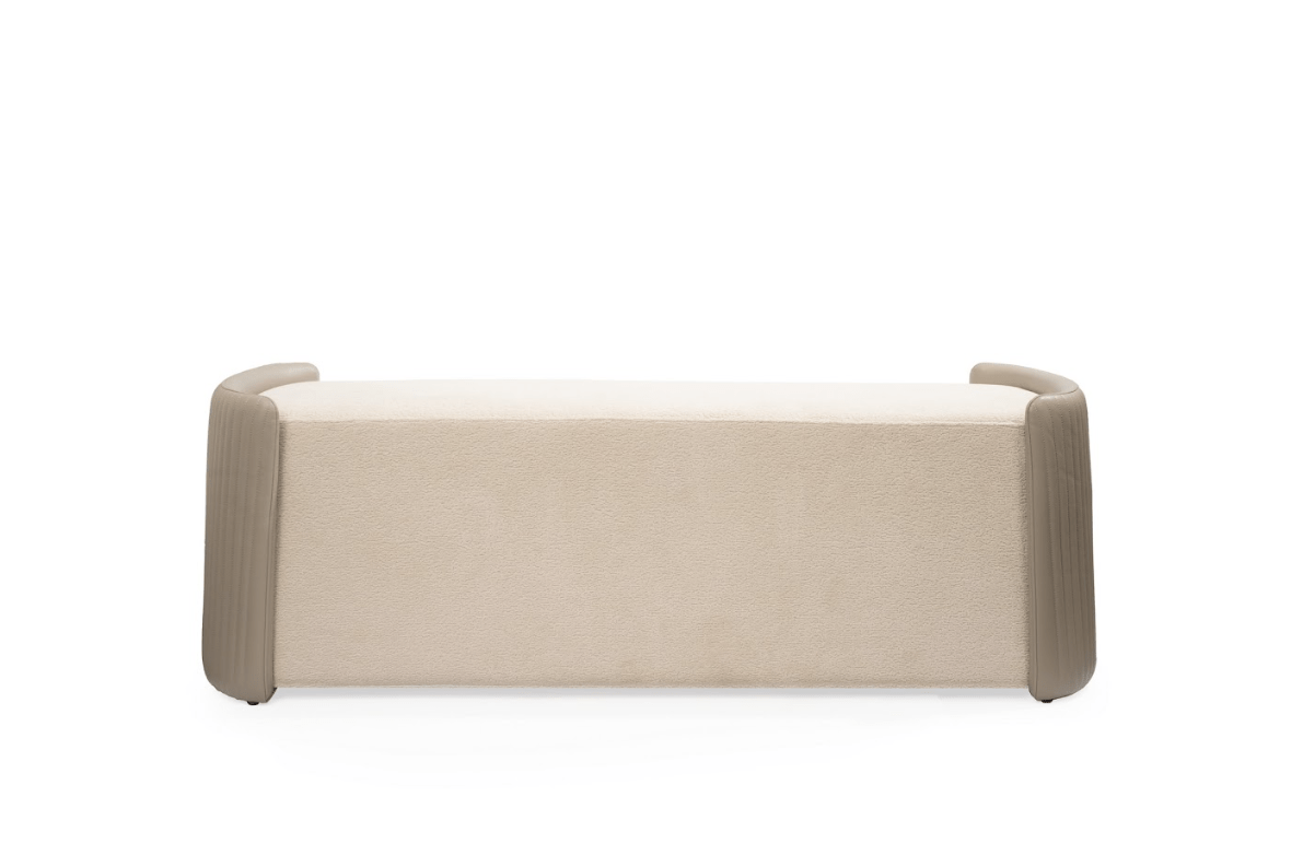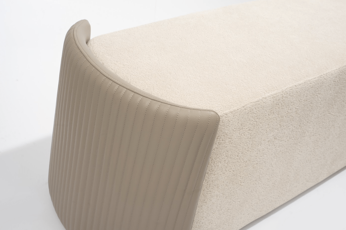 The Lobby Bench is a refined expression of texture and tone. Cloaked in tactile boucle with contrasting panels, it offers visual interest without overwhelming its surroundings. Its low, solid profile adds grounding presence to a space, while the tonal palette maintains a soft, serene energy.