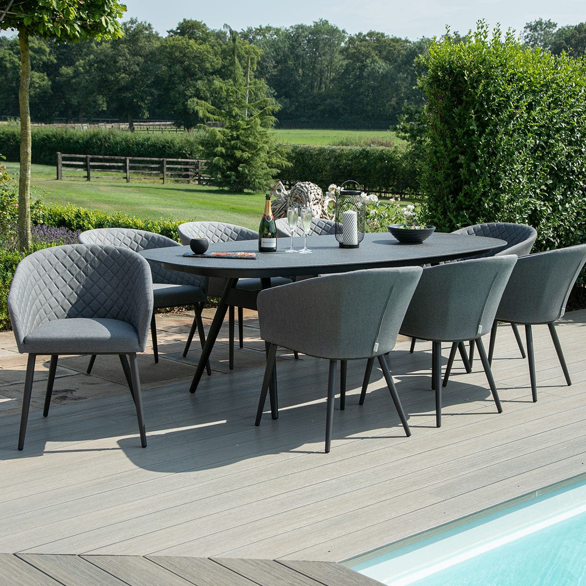 A modern look for your garden is certainly expressed by the Ambition Range. Eight Quilted chairs surround a Oval Spray Stone Glass table, big enough to seat everyone in comfort.