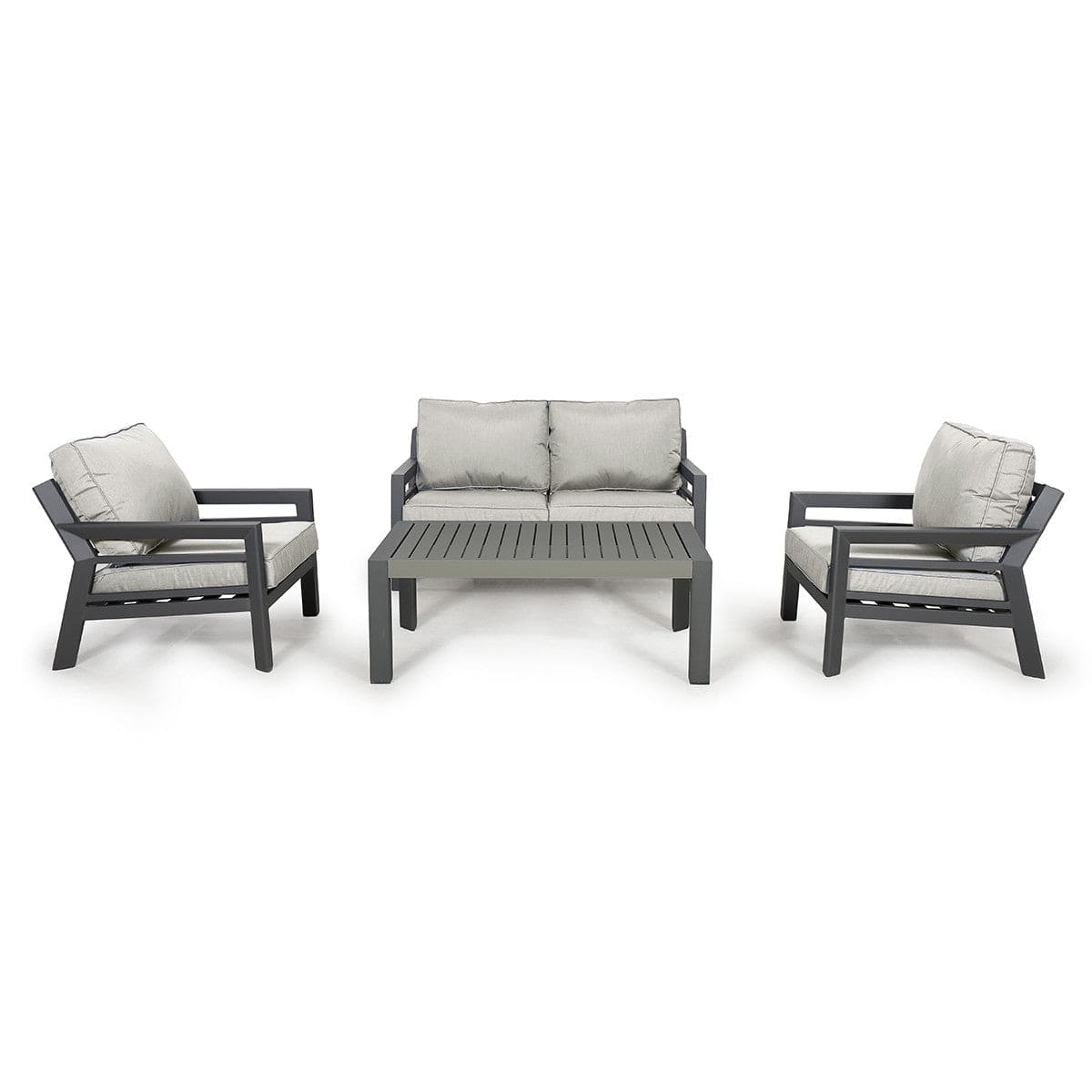 The Maze New York 2 Seat Sofa Set is extremely low in maintenance and an ideal solution to your need for chic outdoor relaxation. The slatted aluminium coffee table is stunning with two tones of grey, the table top featuring a light finish opposing the dark grey of the legs. Our eye-catching armchairs and two seat sofa with stylized arms include comfortable back and seat cushions, the seat cushions also come with ties to ensure they're kept securely in place. The dark grey framework is beautifully complimented by a new pale grey colourway cushion for 2024. Please note: We recommend the use of our own range of covers for aluminium furniture sets, these are specifically designed for the use with our furniture and using an external supplier’s cover may void your warranty. Our range of Pro 300 Outdoor Covers are heavyweight made of 300gsm polyester with a protective inner mesh.