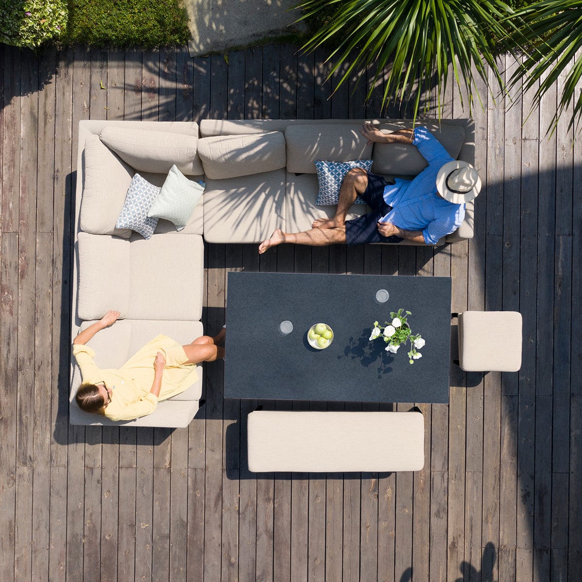 The original set which launched our popular Pulse Range, the Pulse Corner Dining carries all the traits of the more compact Pulse Sofa Set, with sumptuous back and base cushions, as well as simple yet strong legs that help create the refined, fuss-free look and feel. The set comes with the rising table feature, transfer your L shaped corner sofa from a casual dining experience into a relaxed setting. Made from high performance outdoor fabric and materials, the corner sofa is designed to be outside all year round. Prepare your garden in time for Spring with a simple jet wash and leave your set to dry in the warming sun ready for months of use during the warmer season.