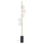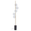 This five bulb floor lamp has a brass finish metal stand supporting five spherical lampshades. The cylindrical black marble base provides durable support to the stem and complements the sleek aesthetic.