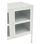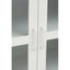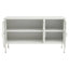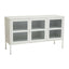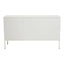 This sideboard has three glass doors revealing adjustable inner shelves for storing or decorative items. The sturdy white powder coated metal design with matching handles and sleek legs creates a simple and streamlined classic aesthetic.
