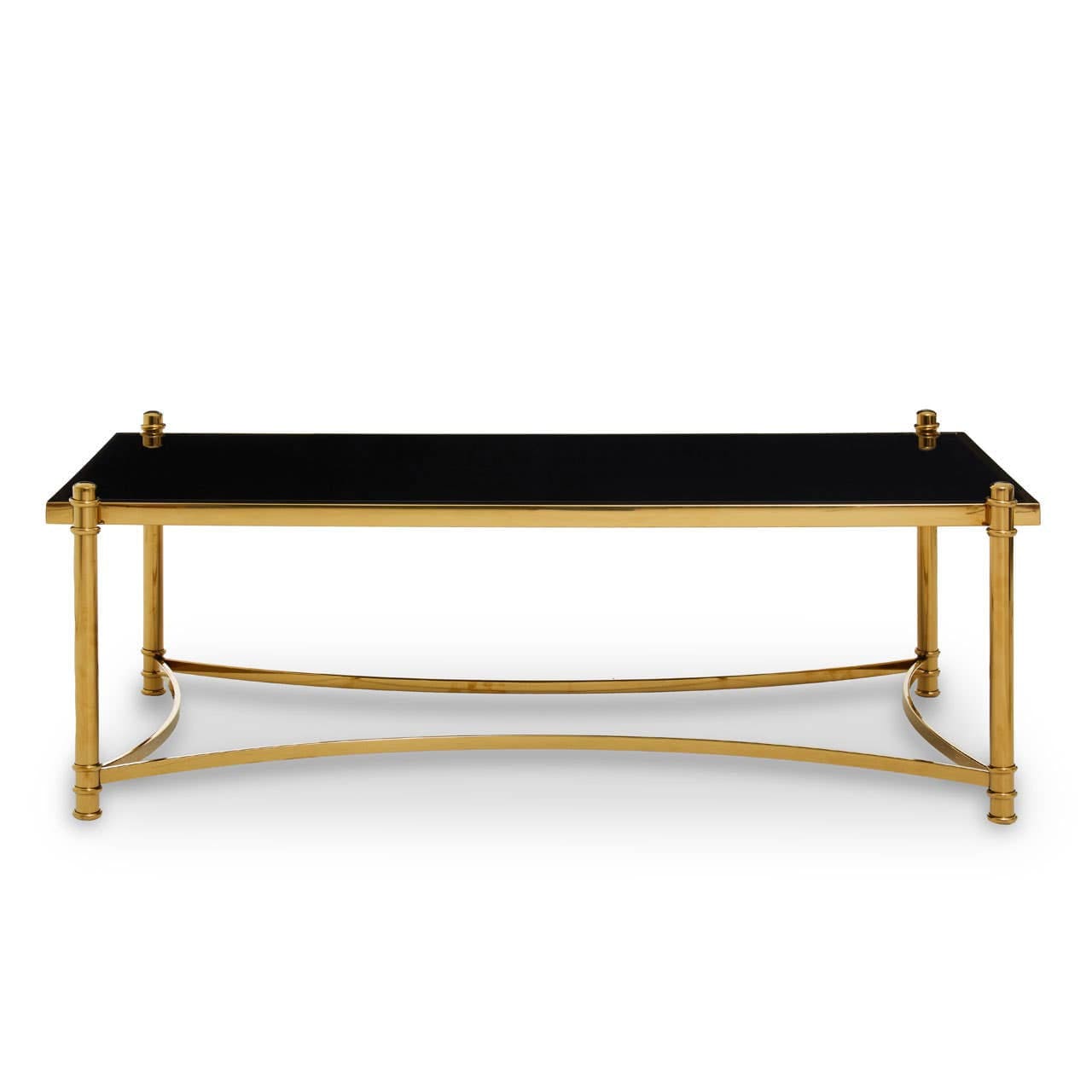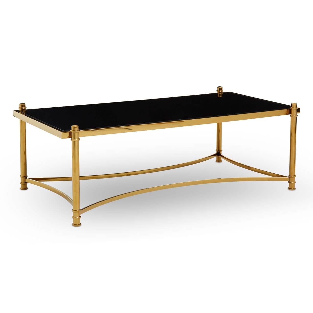 With sleek lines and complementary materials, this coffee table will add sparkle and style to living room decor. Its warm metallic stainless steel slender legs with stretcher base neatly hold an elegant black glass top.