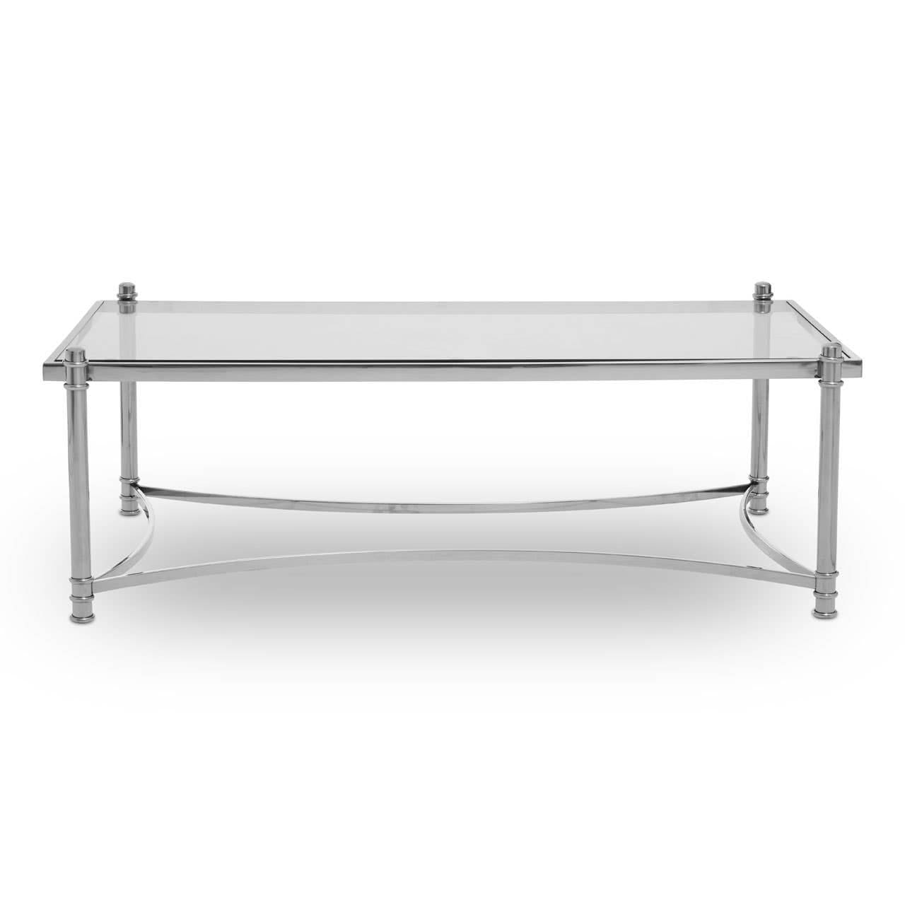 With sleek lines and complementary materials, this coffee table will add sparkle and style to living room decor. Its metallic silver stainless steel slender legs with stretcher base neatly hold an elegant clear glass top.