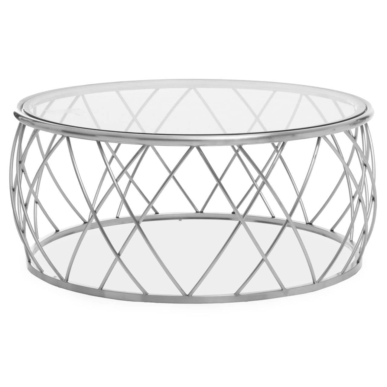 Make a modern statement with your decor. The Ackley coffee table has a clear glass top and patterned silver frame. The geomertic patterns of the sleek metallic lines add texture and depth to interior. Hastle of the frame is perfectly complemented by the clear glass top.