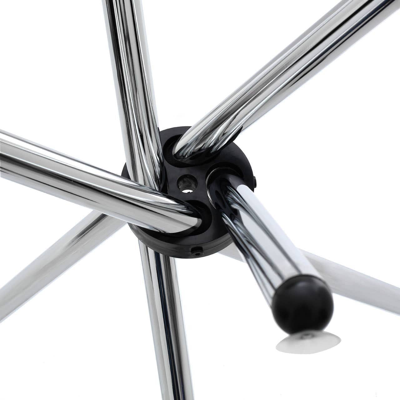 This dining table has a clear glass top that lends it a contemporary and airy feel. Made of metal, it features a cross base with four angular legs in a silver finish which add stability and provide a solid foundation to the glass top.
