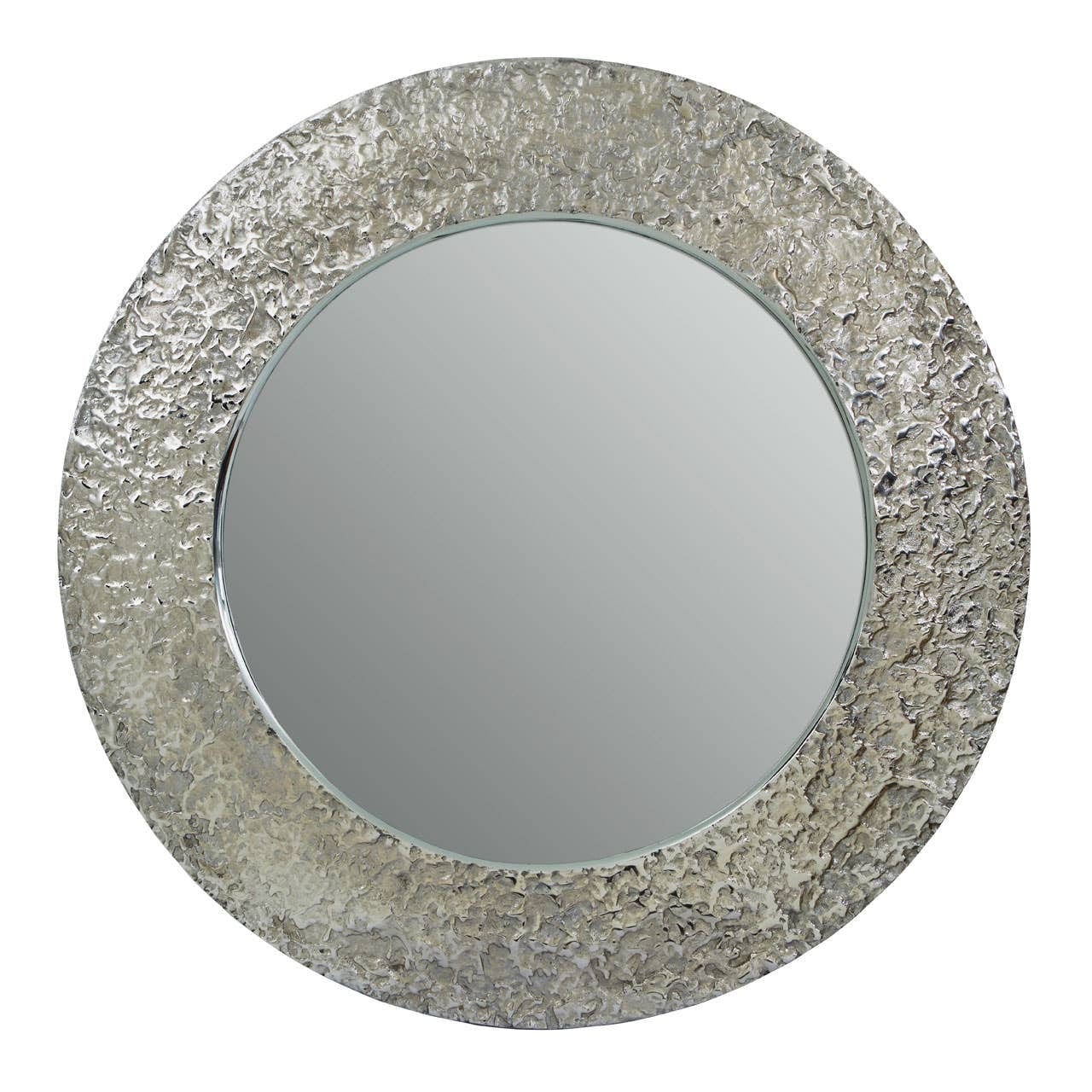 Round in shape, this nickel finished, hammered texture wall mirror is a stunning focal point. Style with natural materials for a paired down look or pair with more luxe pieces for an enhanced, glamorous style.
