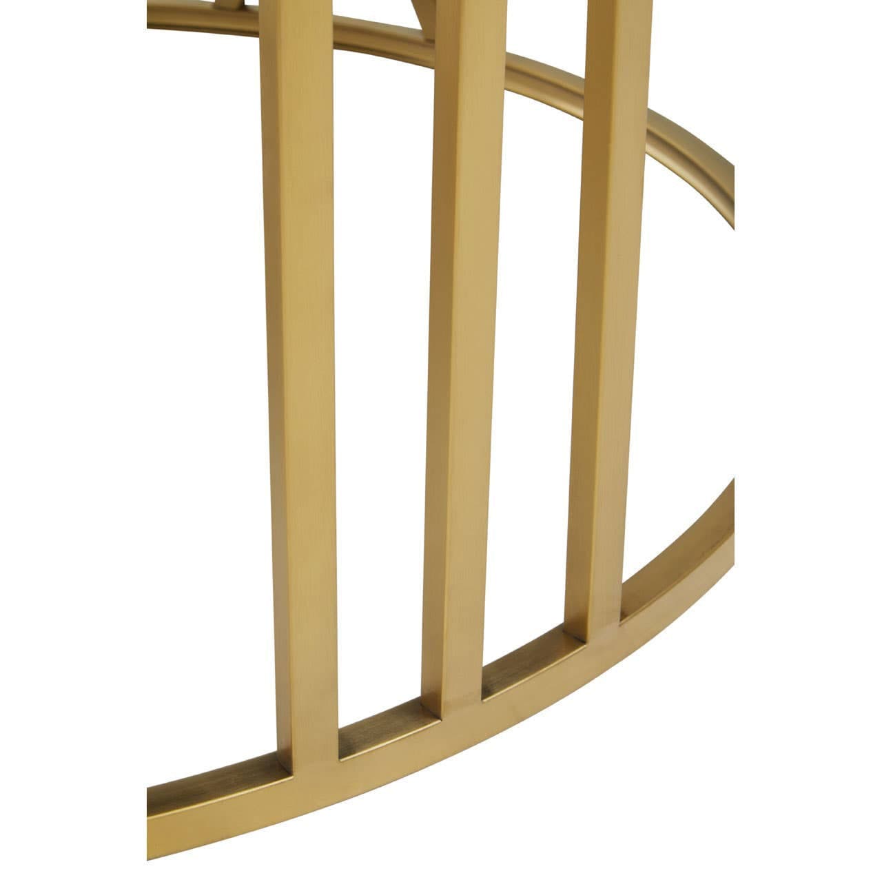 This coffee table flaunts an exquisite style that is crafted into a rounded shape. The stainless steel frame in brushed gold finish features cutout roman numerals that lift the black tempered glass top.
