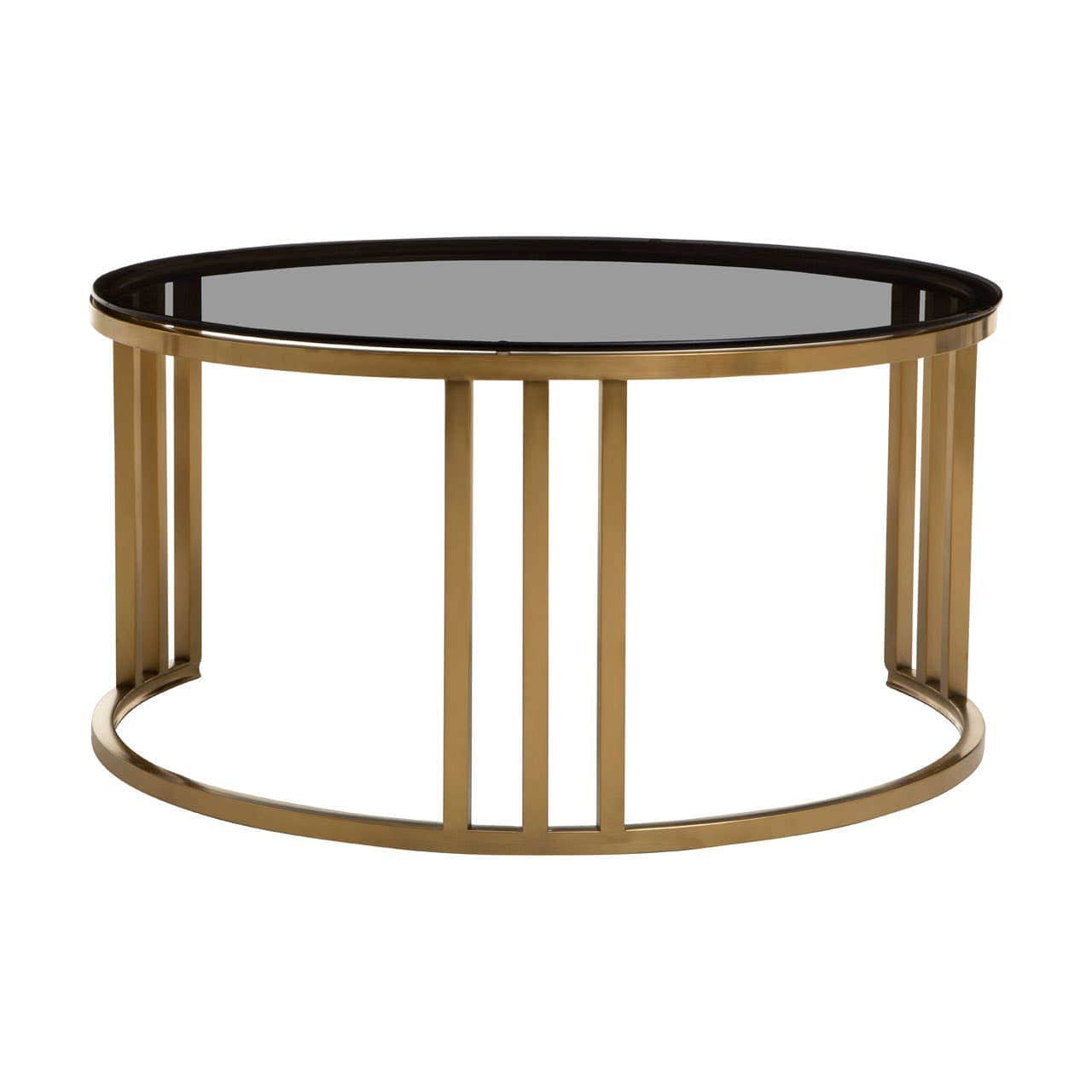 Coming in a set of two, each of these nesting tables have a round tinted tempered glass top. The robust tinted glass contrasts the luxe, brushed gold finish frames featuring clean lines and minimalism.