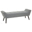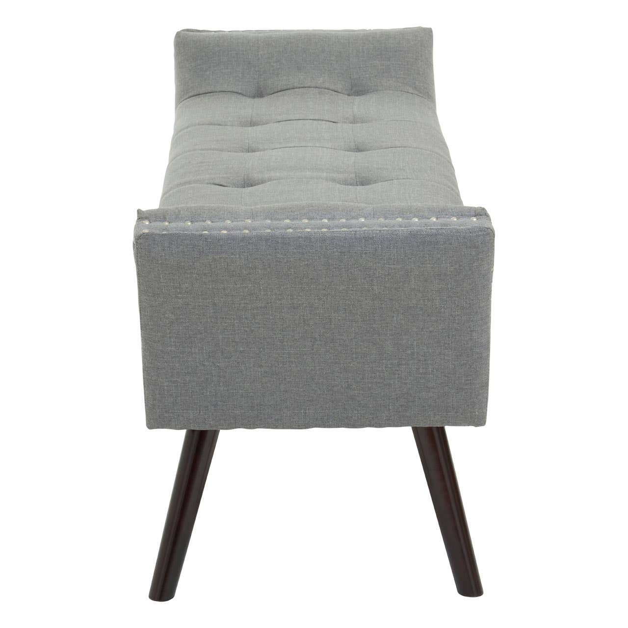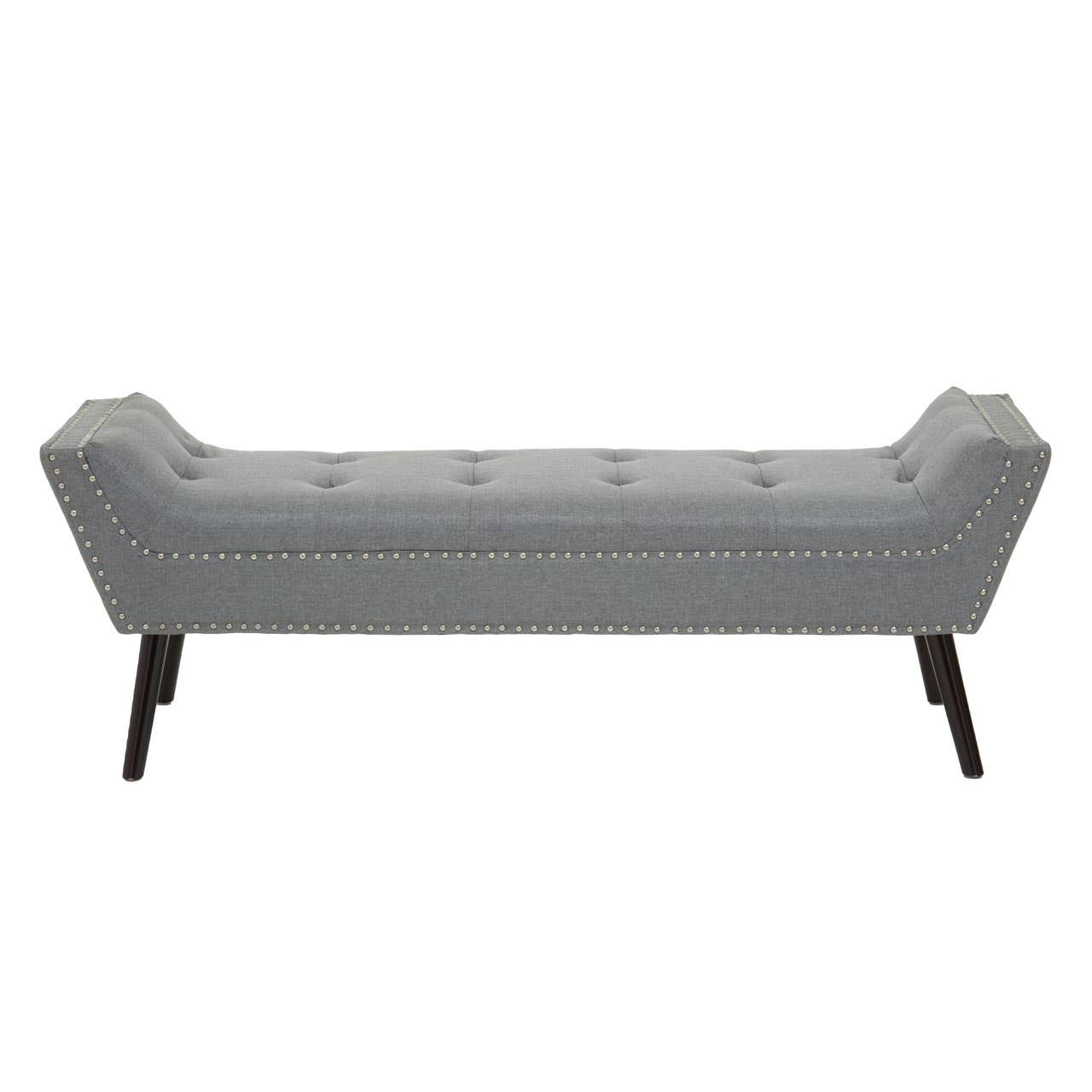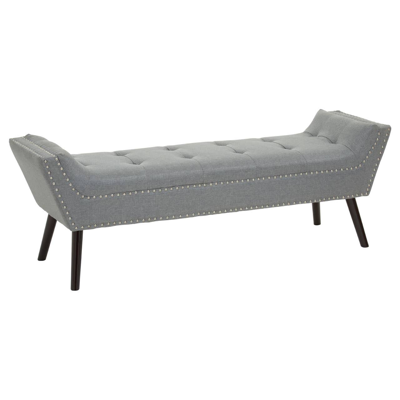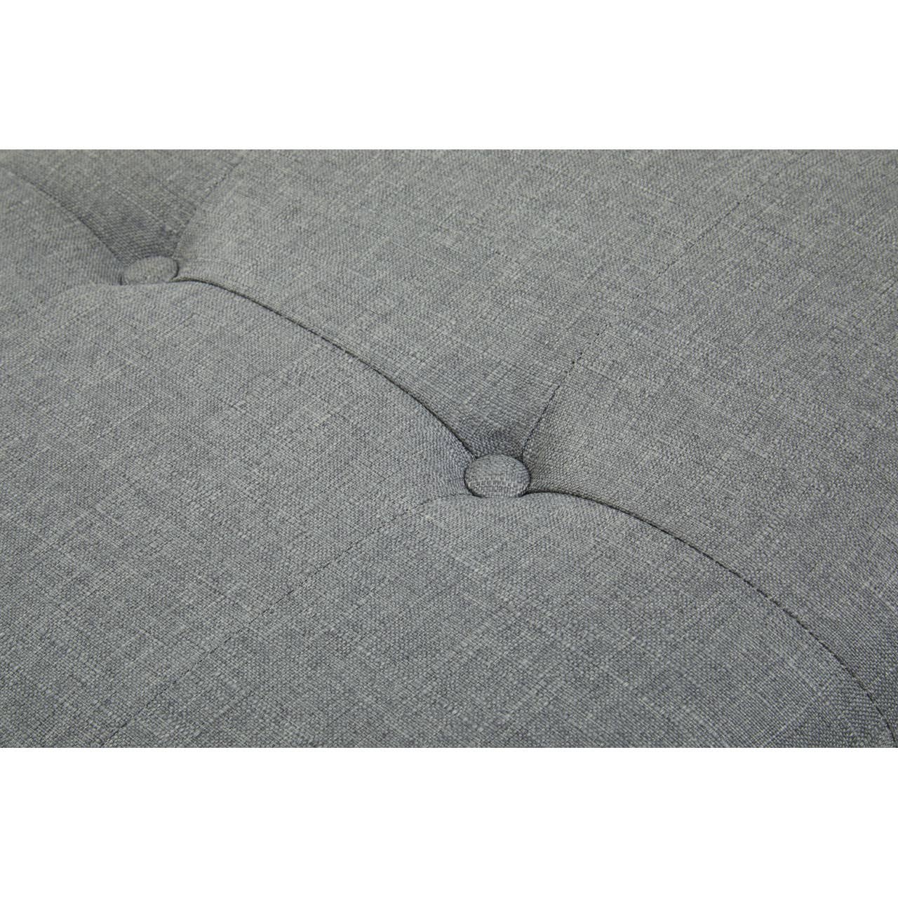 Featuring a button-tufted seat upholstered in tough-wearing grey fabric, this bench will make a contemporary addition to the living area. This bench boasts sloping arms with a stud detail, supported with brown rubberwood tapered legs. A perfect end of bed bench seat.
