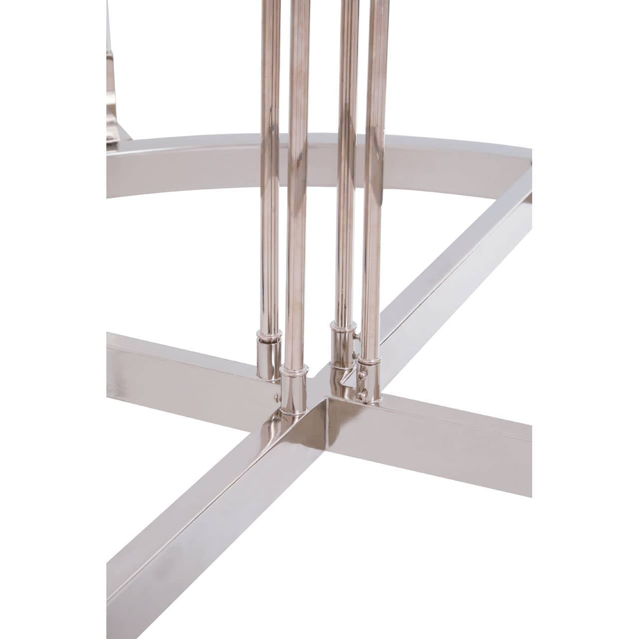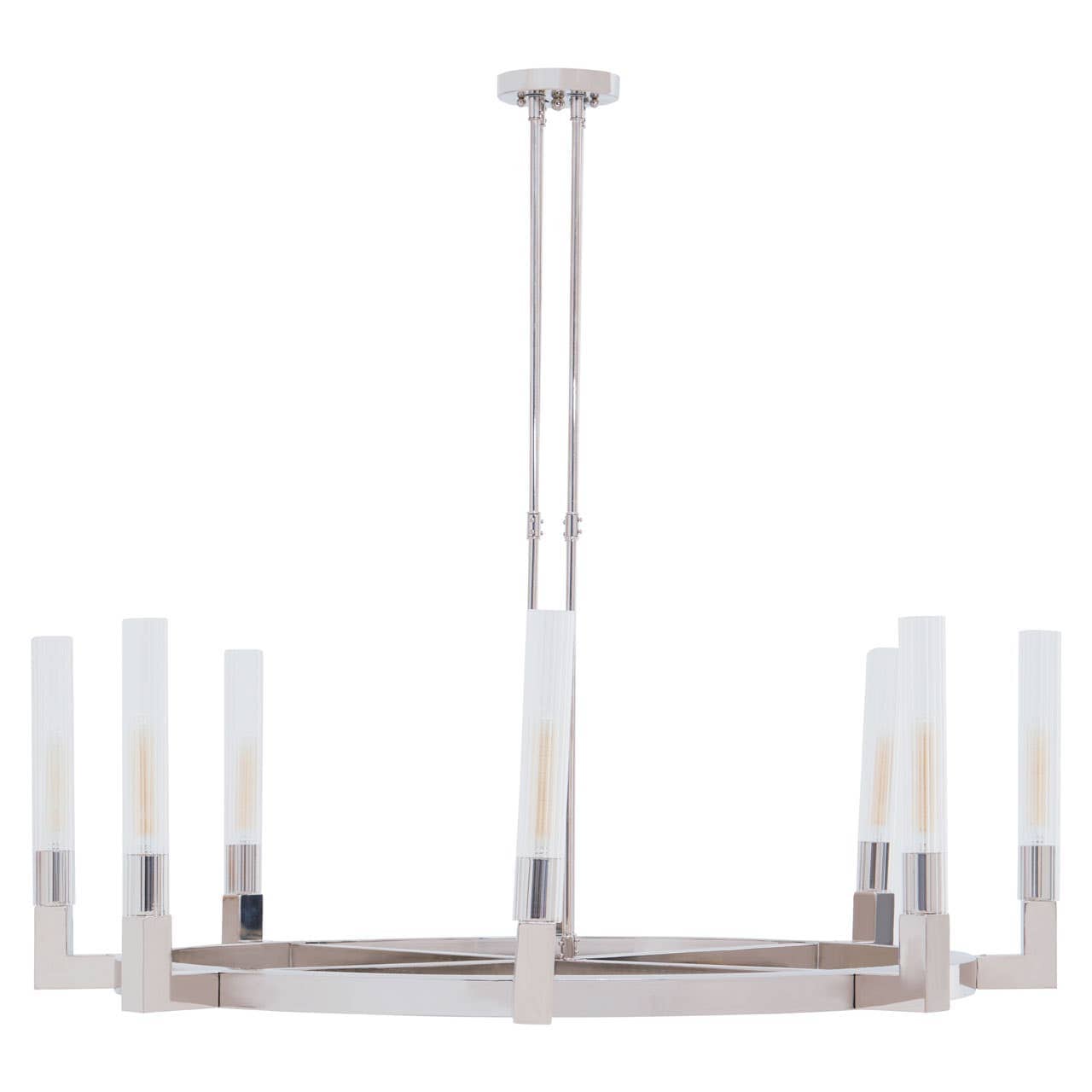 This pendant light exhibits instant glamour and subtle glow with its nickel finish metal frame in a round shape. This contemporary pendant light is accentuated with eight light bulbs that are fixed neatly in fluted effect glass shades.