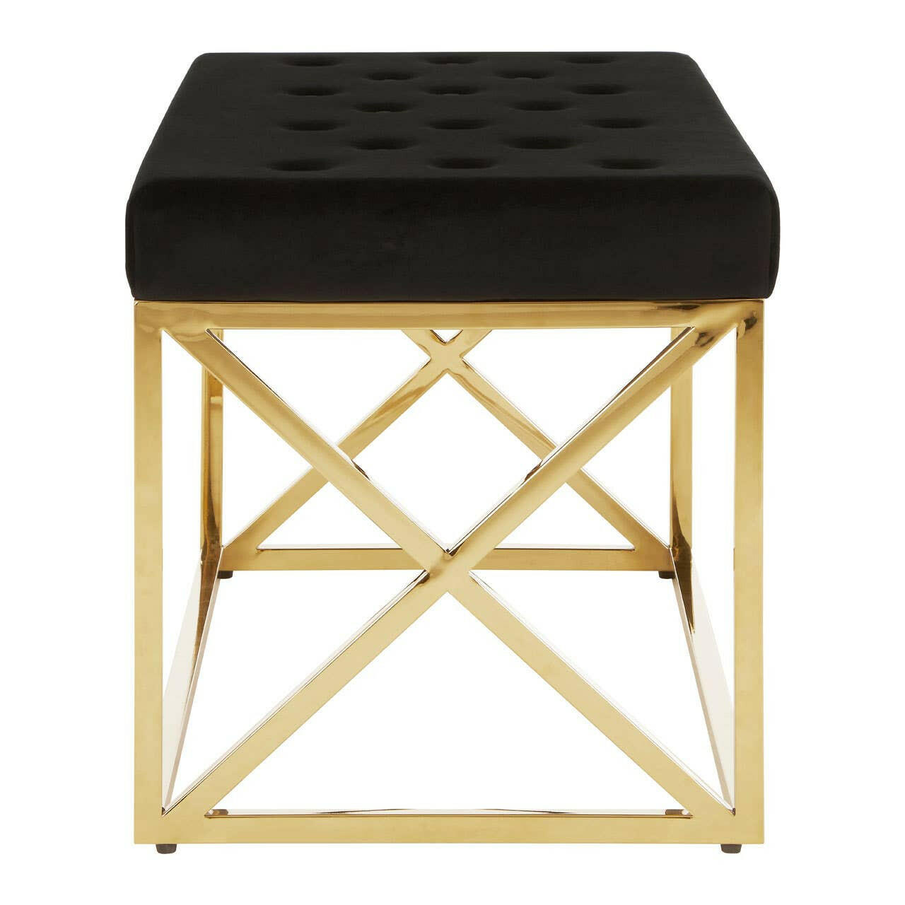 The base of the Allure bench features simple angular design lines, broken up by the geometric pattern created at each end. Made from smooth stainless steel, it boasts a reflective gold finish. The thick cushioned seat is made from soft black velvet, creating a tactile counterpoint to the sleek steel. Coordinate with metallic tones.