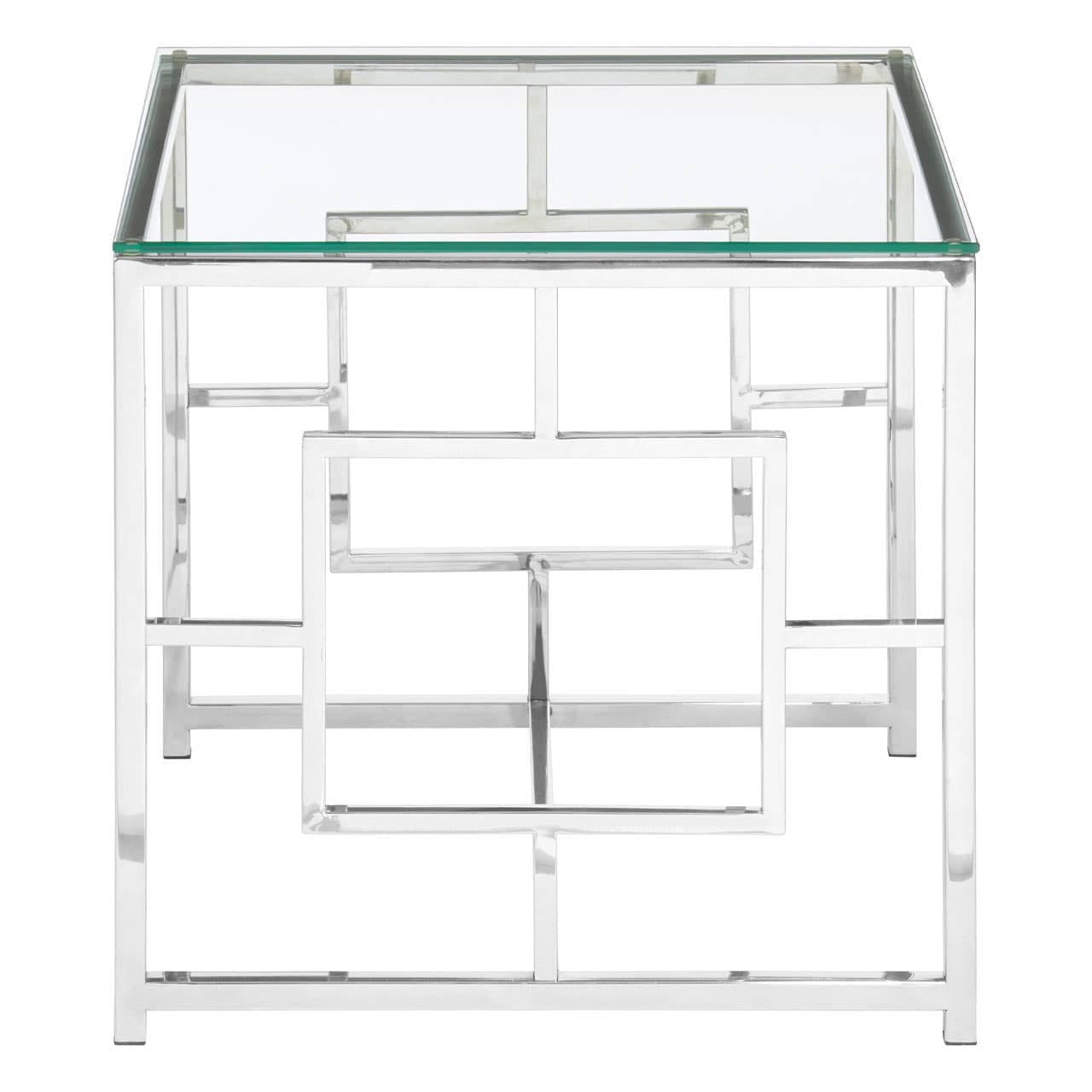 The frame is made from stainless steel, and has a reflective chrome finish with sides that boast a rectangular inset feature. The top is made from tempered glass and has a crystal clear colour. It looks great styled with metallic accessories.