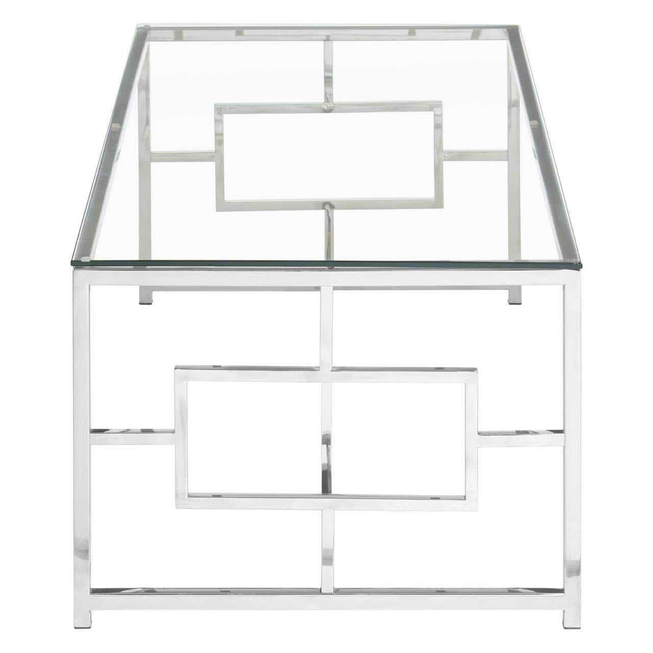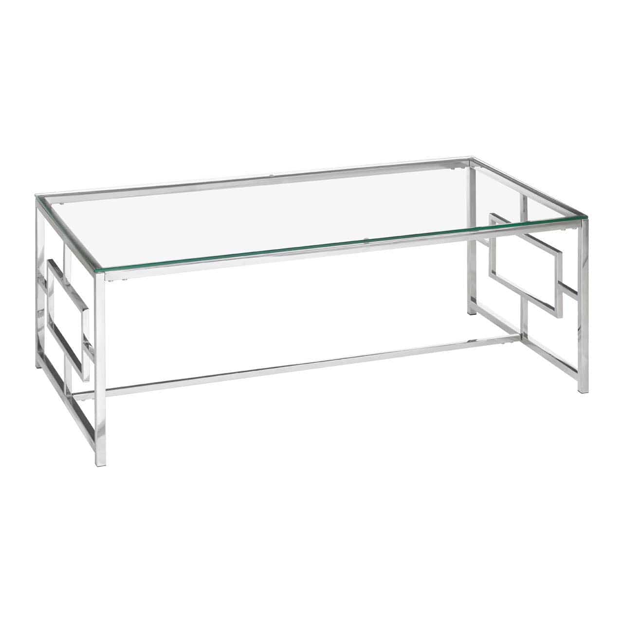 The frame is made from stainless steel, and has a reflective chrome finish with sides that boast a rectangular inset feature. The top is made from tempered glass and has a crystal clear colour. It looks great styled with metallic accessories.