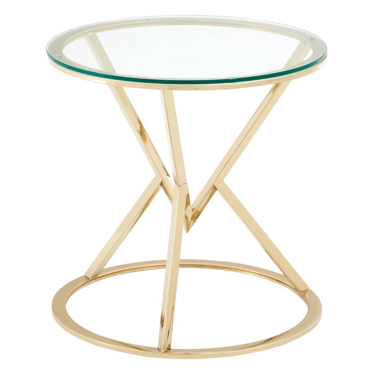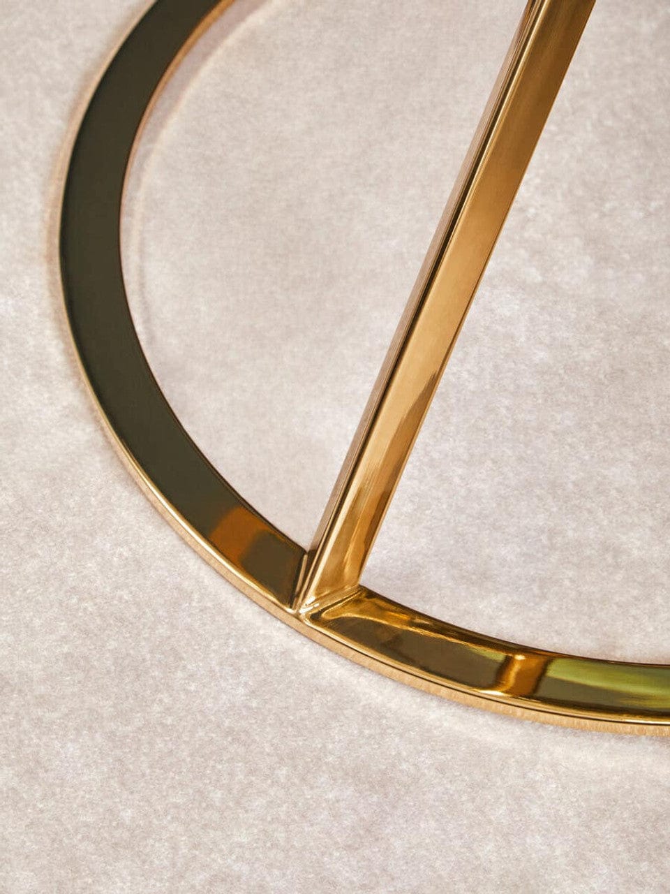 Three lines of golden stainless steel descend from the top circle to a pointed finish. A further three lines reach down to the circular base, the symmetry resulting in an angular hourglass shape. The top circle acts as a mount for the clear tempered glass tabletop. Display it with reflective metallic furnishings in a boutique hotel-style interior design setting.