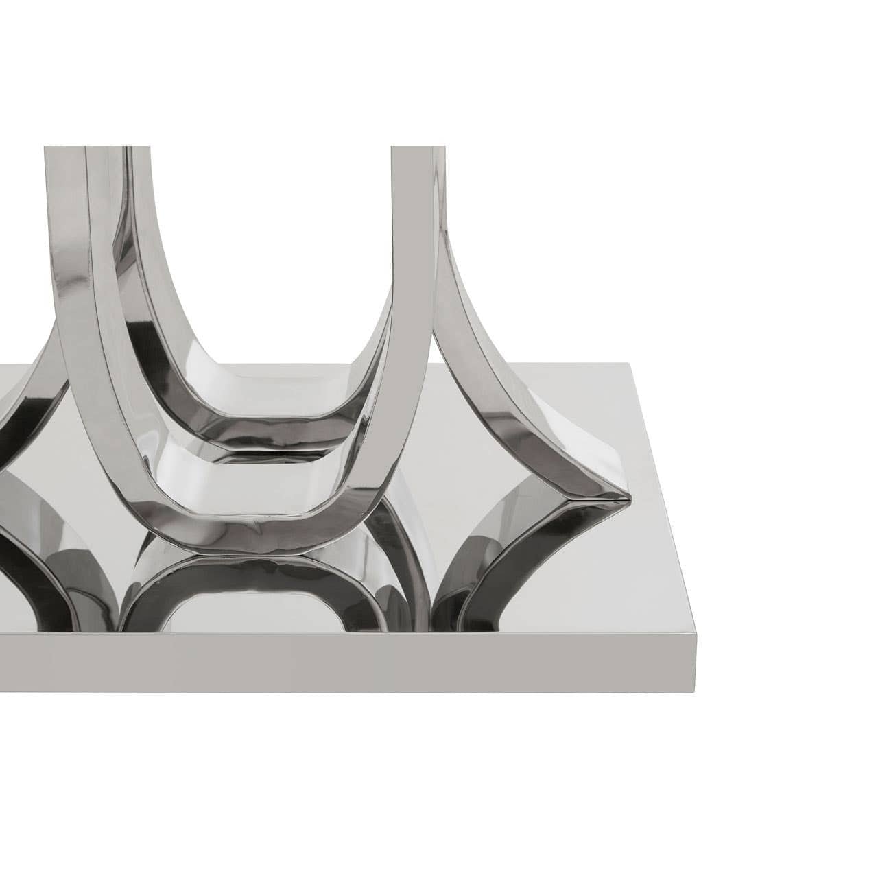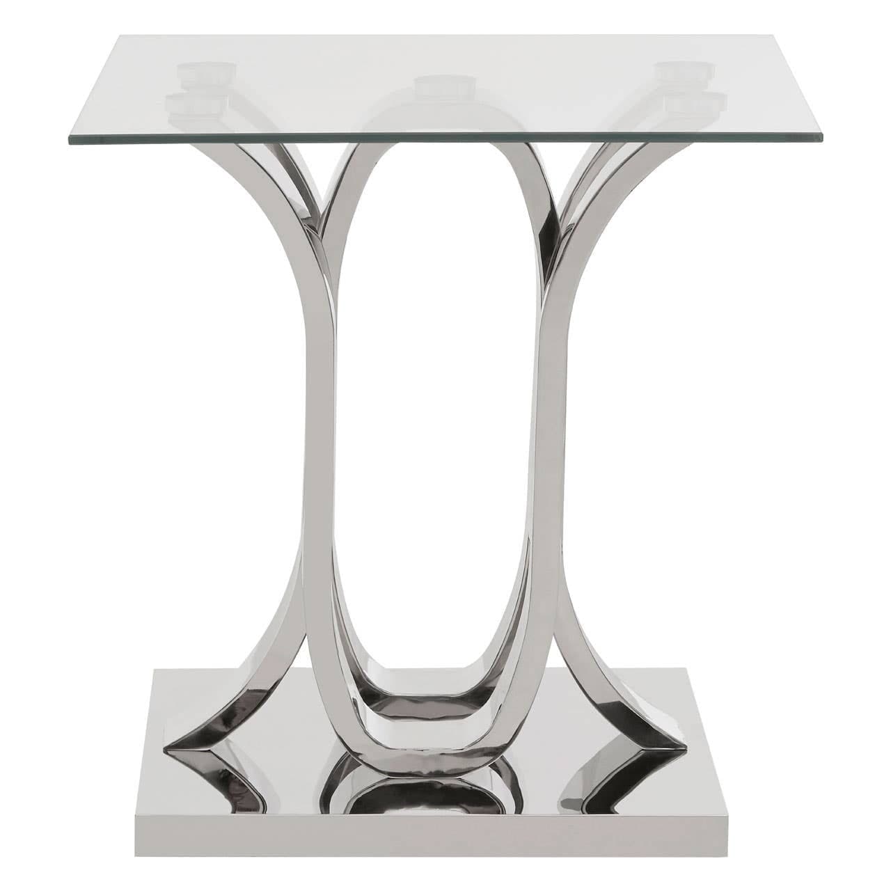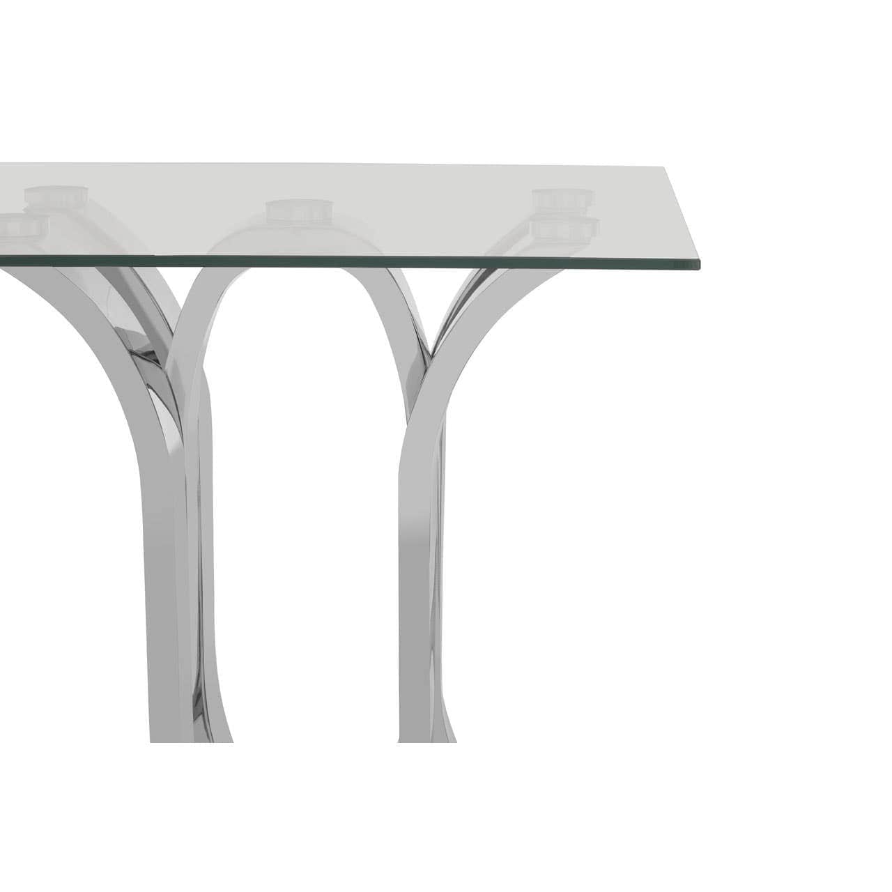 Its base and stand are made from sleek stainless steel and have a mirrored finish that complements silver coloured metallic accessories. The arcing lines of the stand soften the look, subverting the sharp angles of the base and top. The clear glass top creates a light finish and adds to the table's contemporary appeal.