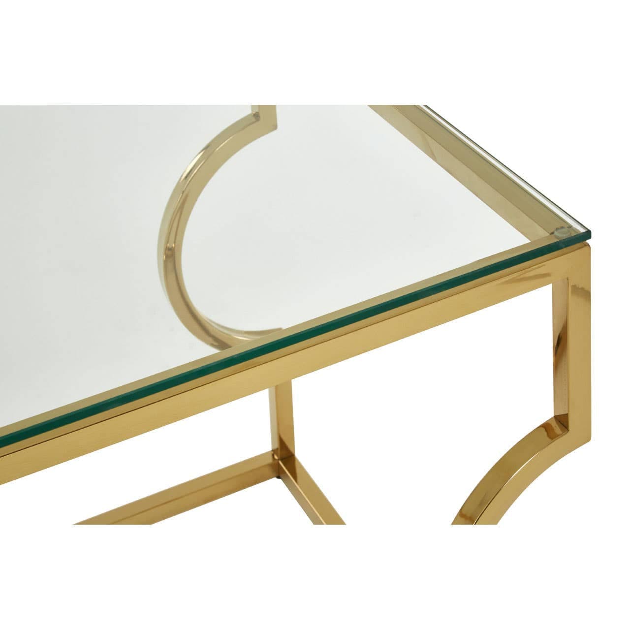 Semi-circular indents at each side subvert the angular lines of the Allure end table. Made from smooth stainless steel, the frame has a gold finish that makes the table easy to pair with warm metallic accessories. The table is topped by rectangular pane of clear tempered glass.