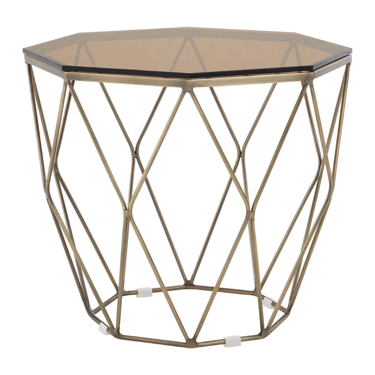 The Allure end table uses slim strips of metal to create a striking geometric base. The diamond shaped patterns are accentuated by the metal's brushed bronze finish. A slim band of metal separates the base from the amber smoked tempered glass tabletop, its hexagonal shape adding to the table's polygonal appeal.