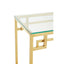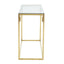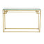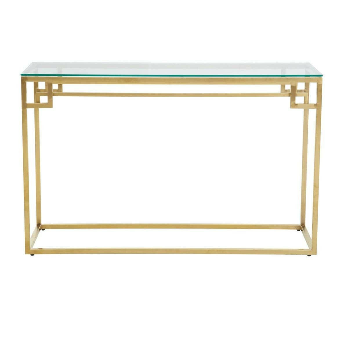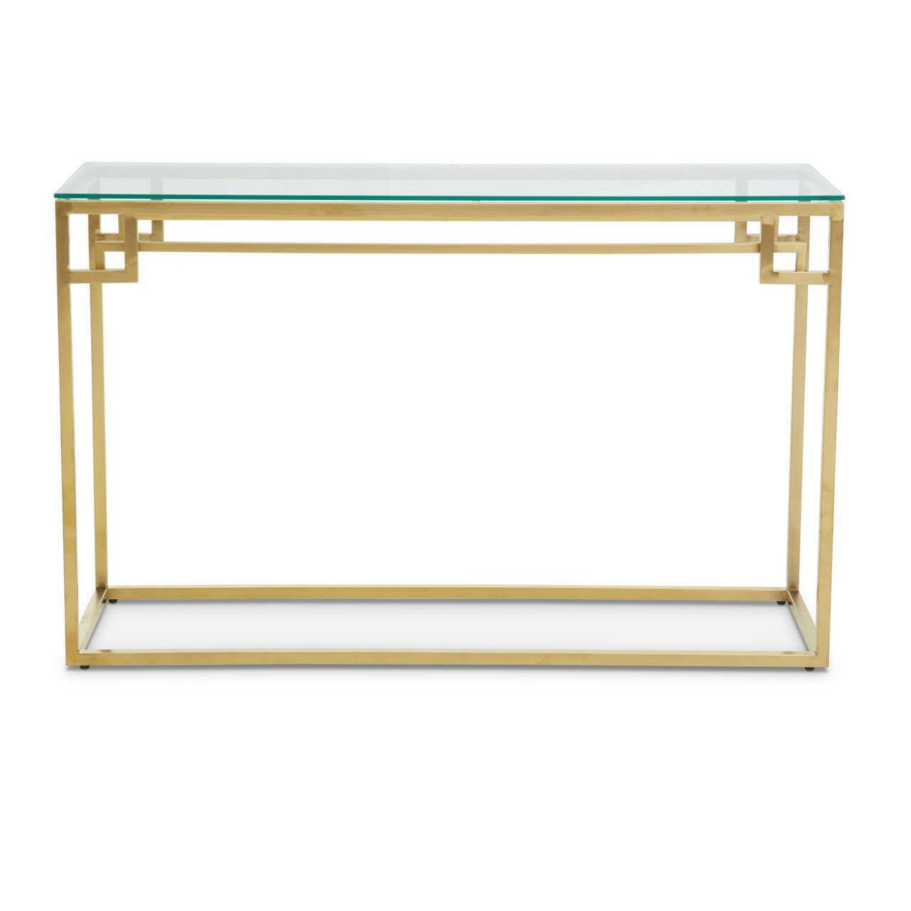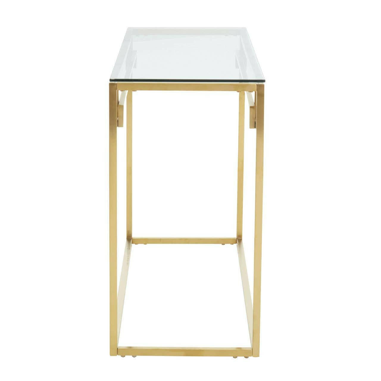 Streamlined with clean and sharp edges, this console table owns chick minimalistic aesthetic supported by an open gold brushed stainless steel frame with the table top glass. The frame is designed to withstand different conditions matching all modern aesthetics.