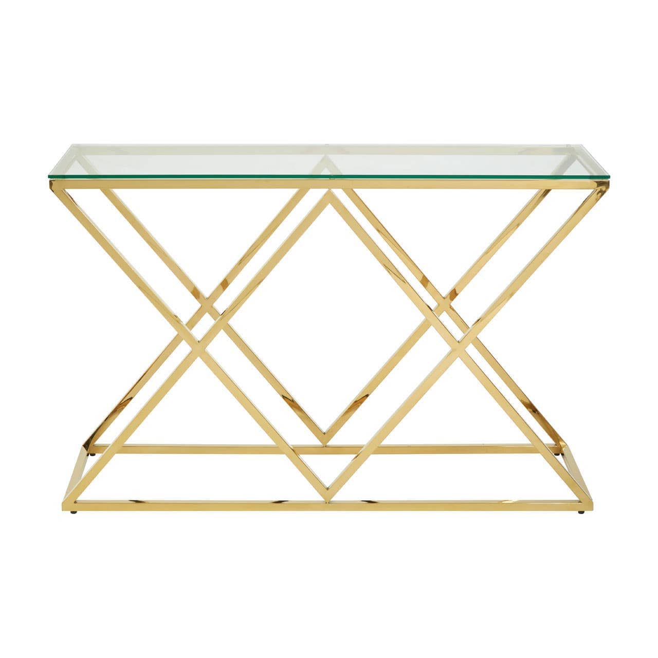 This console table features a rectangular design with a clear tempered glass top and a gold finish stainless steel frame. The inverted triangular base creates a sleek and sophisticated look, while the diamond pattern adds an art deco allure.