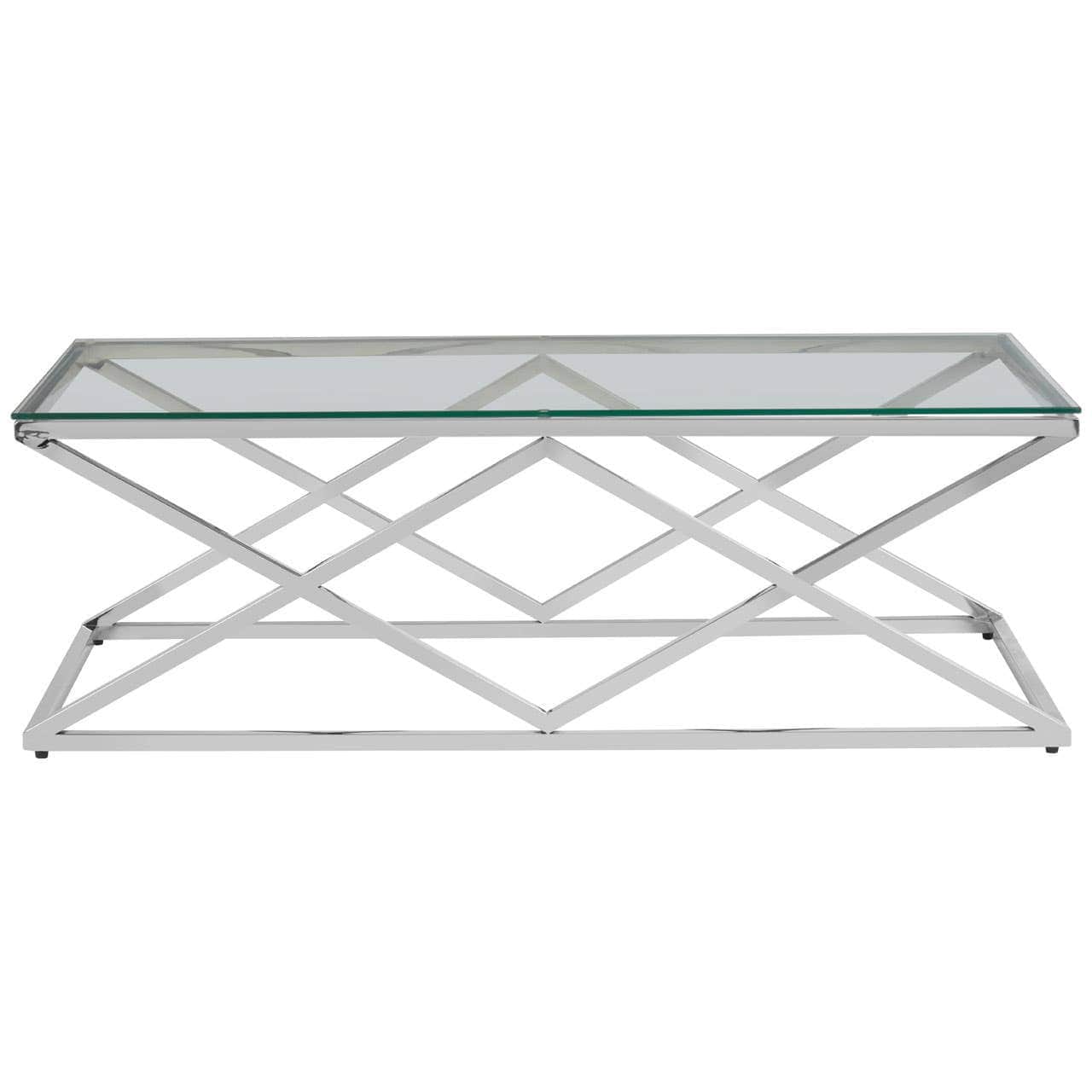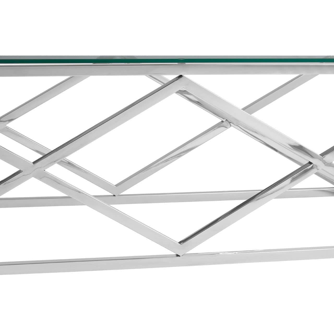 The smooth stainless steel frame has a reflective silver finish, and the rectangular top is made from clear tempered glass. Display it in the living room to make a luxe design statement.