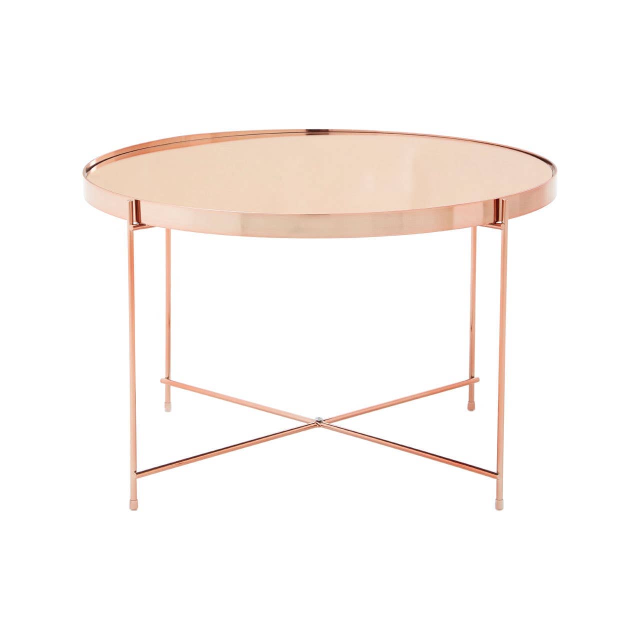 A round pane of mirrored glass is set into a band of metal. The metal has a warm rose gold finish that complements the pink glass. A simple metal lattice supports the tabletop, attached to which are four slim legs that give the table a lean aesthetic. Another lattice is formed at the base to create angled lines that counterpoint the round tabletop.