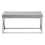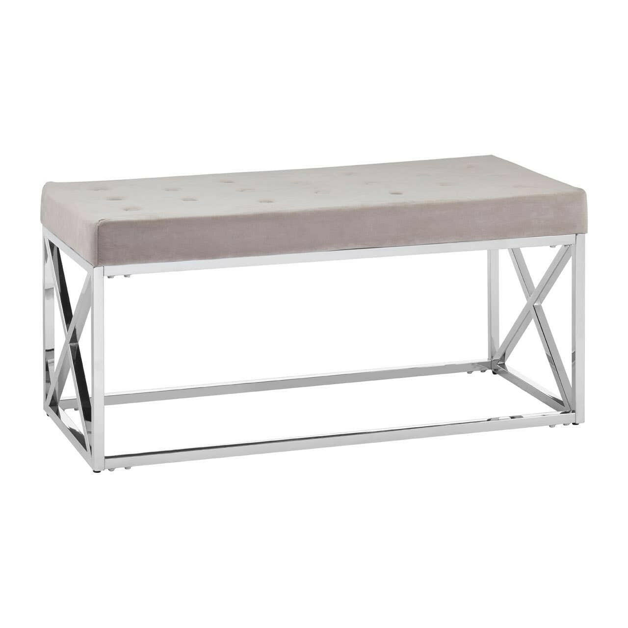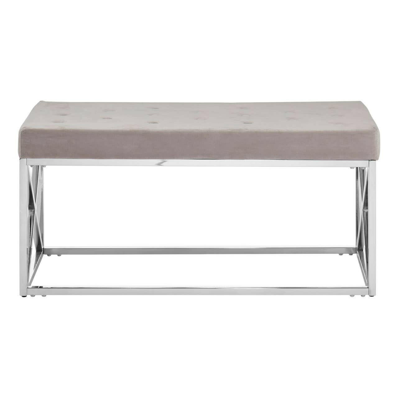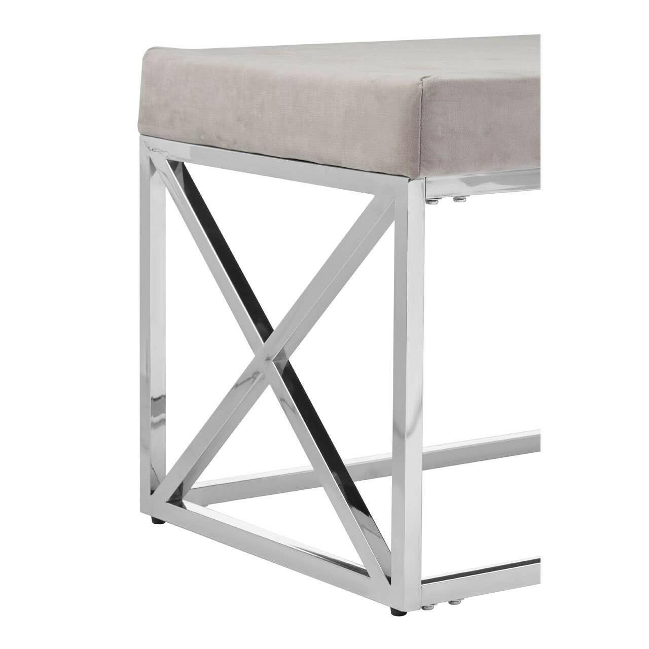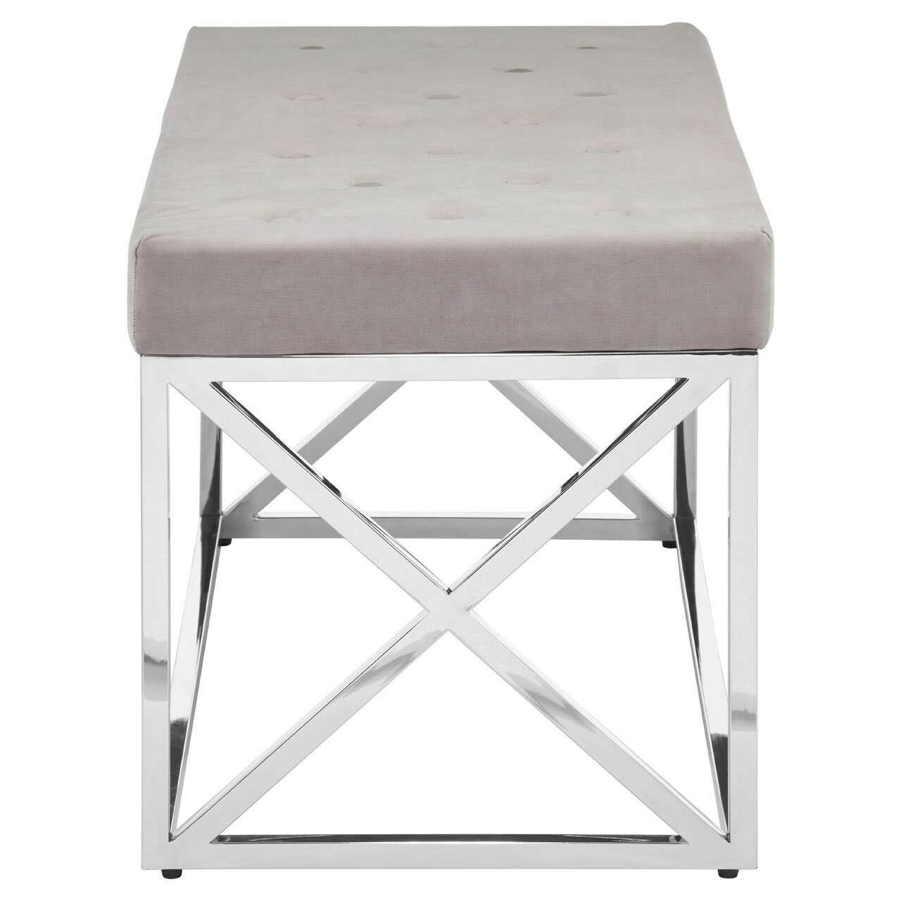 The base of the Allure bench features simple angular design lines, broken up by the geometric pattern created at each end. Made from smooth stainless steel, it boasts a reflective silver finish. The thick cushioned seat is made from soft mink-toned velvet, creating a tactile counterpoint to the sleek steel. Coordinate with metallic tones.
