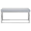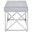 This stylish bench features a frame made from smooth stainless steel. It sports a rich, reflective gold finish, and has minimal lines which are interrupted by the cross sections at each side. The plump seat is upholstered with plush powder blue velvet. It looks great styled with luxe design furniture and lighting.