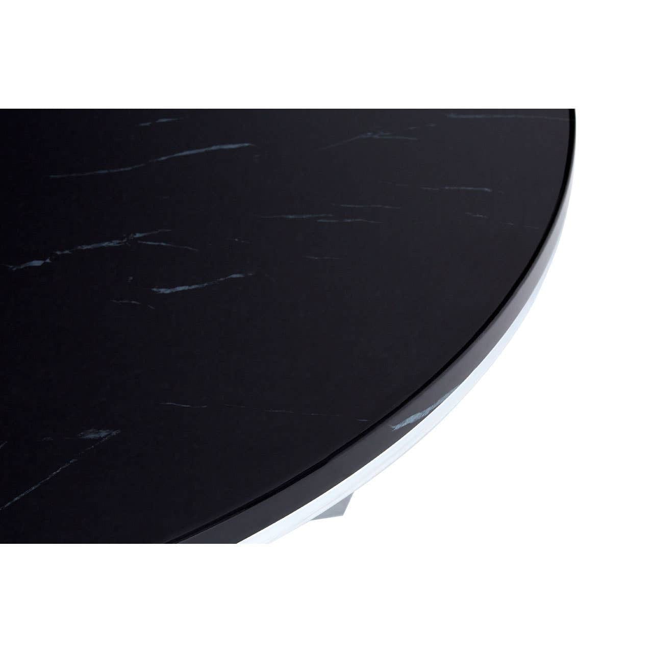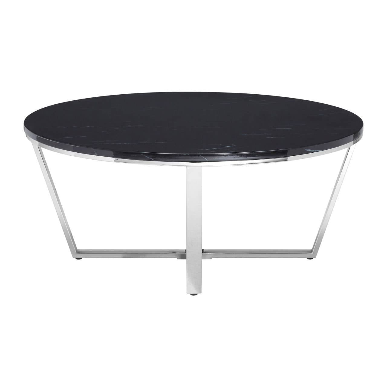 The Allure coffee table's round surface is made from faux marble, with white veining detail offsetting the black. It rests upon a sliver of silver coloured metal that transitions into the angled metal legs. The simple lattice design at the base of the legs creates flow, enhancing the allure of this luxurious boutique hotel style piece.
