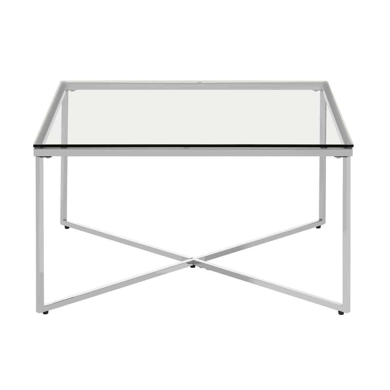 This coffee table makes a sophisticated impression thanks to its minimal-style frame, with an intersecting base for a subtle design flourish. The frame is finished in silver for a luxurious look and is reflective. The silver creates the perfect partner for the clear tempered glass top. Style with luxe furniture for a coordinated look.