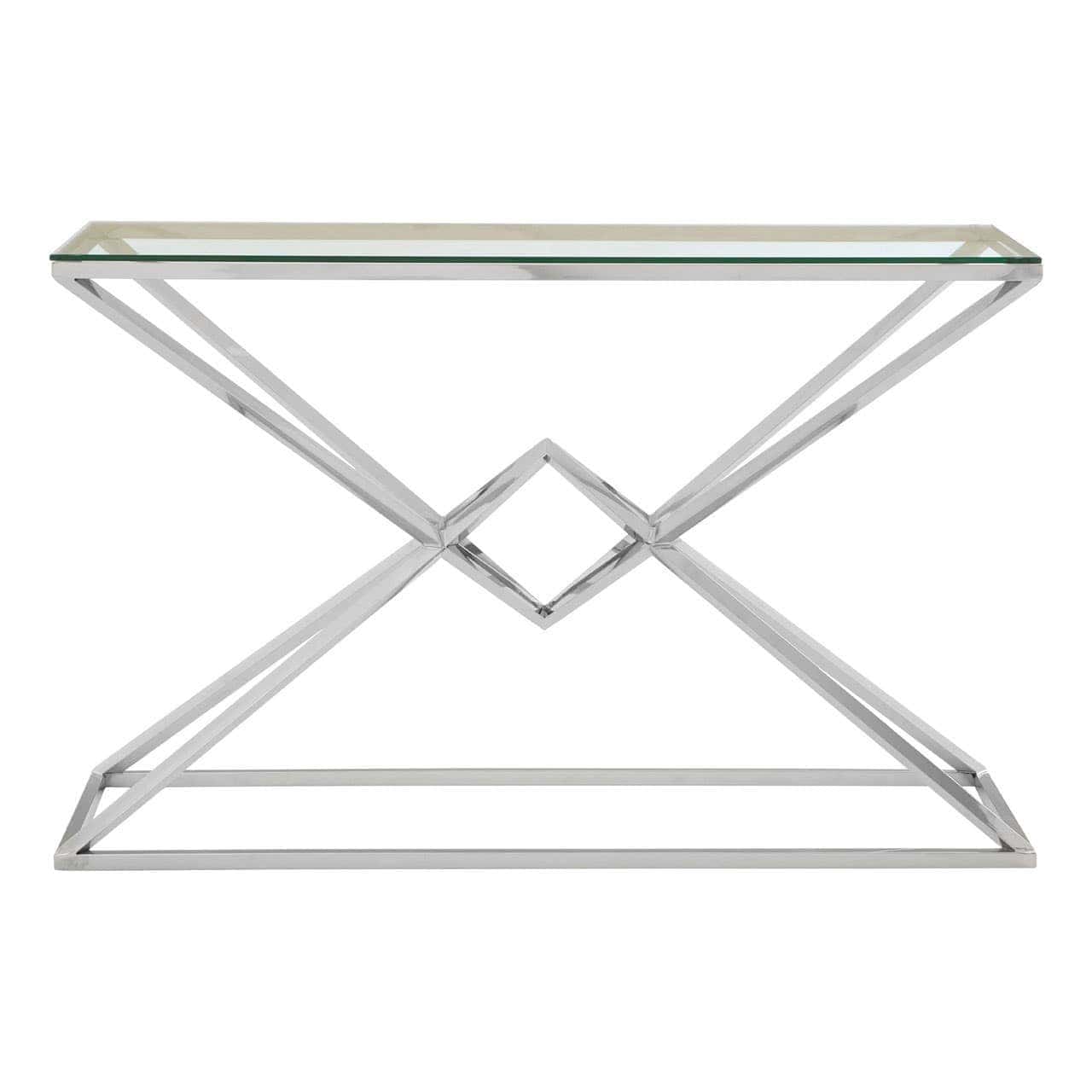 This console table has a rectangular design with a clear glass top and a silver finish stainless steel frame. The sculptural base has a dramatic open design with a pair of intersecting pyramid frames that create an intriguing diamond centre.