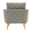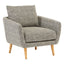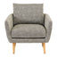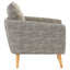 This low slung contemporary chair features a wide and deep seat, supplemented by a plump cushioned backrest. Its woven twill fabric surface is textured to the touch, with black and white flecks enhancing the grey. Solid wood legs support the seat, their natural tone complementing the fabric. Coordinate this laid back chair with the Alto sofa.