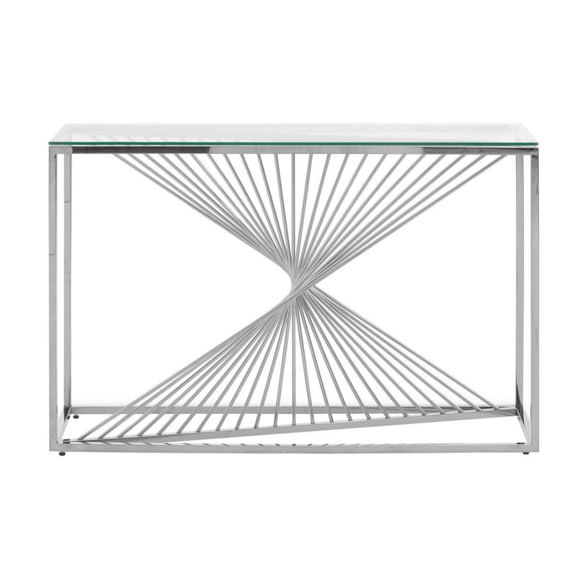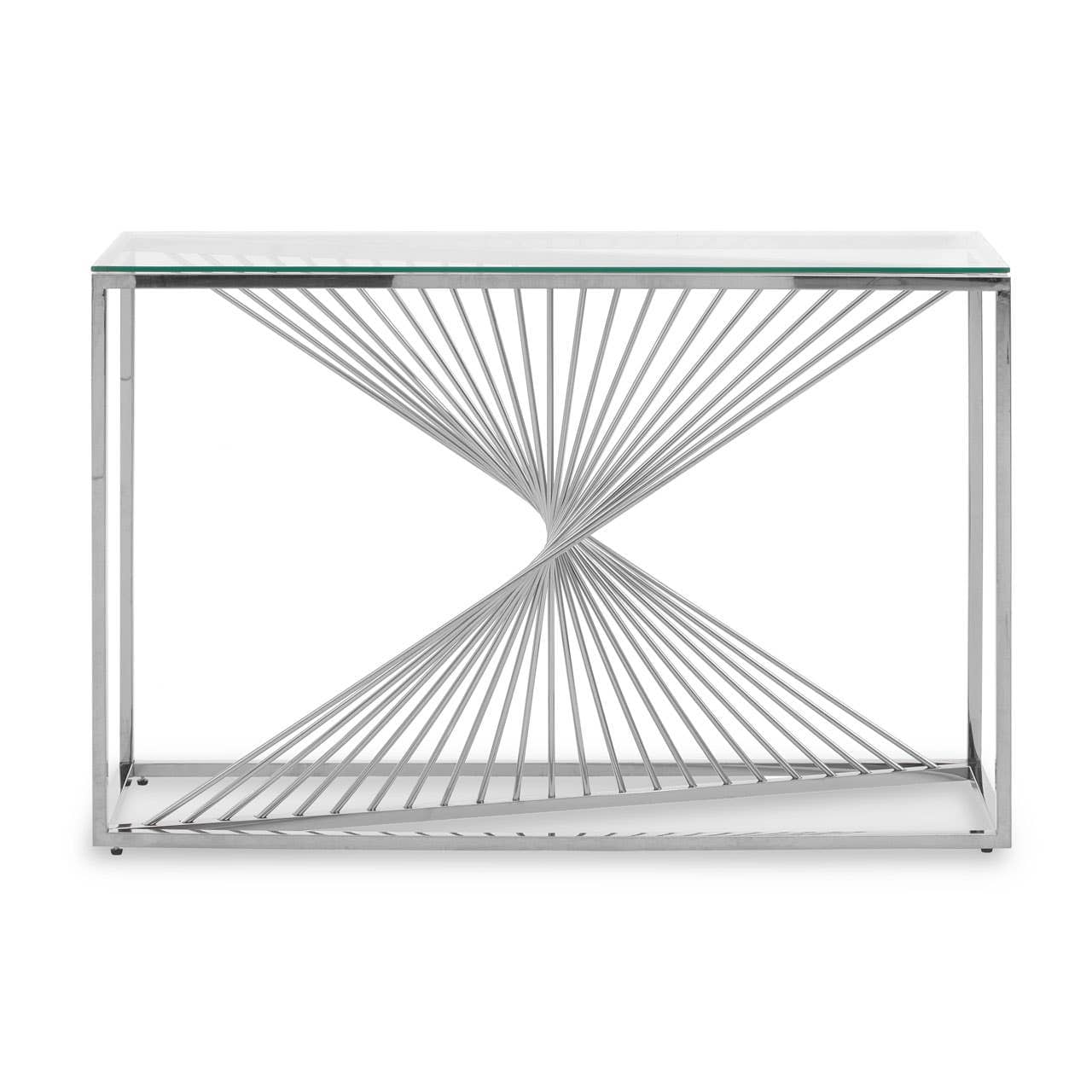 This console table brings an elegant juxtaposition of charm and opulence with its clean lines and a decorative abstract centre in the metallic silver finish. The clear glass sits above the sculptural base and enhances sophistication.