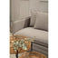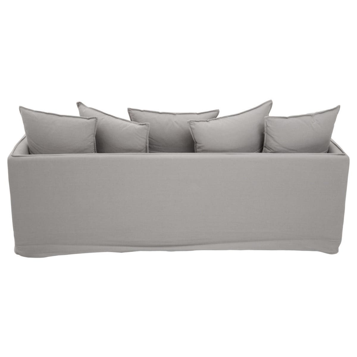 The three-seater sofa features grey coloured linen upholstery with padded seat and matching cushions. The sofa is adorned with linear detailing on the lower front which adds to its luxe aesthetic.
