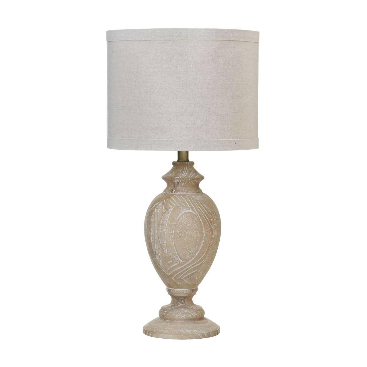 The Antlia table lamp features a curved base that gently contours and bevels to create a shapely design. The lightwood's natural grain lends rustic appeal to the lamp's carved base. Complementing the natural appeal of the base, the neutral toned soft fabric shade diffuses light for a soft ambient glow.
