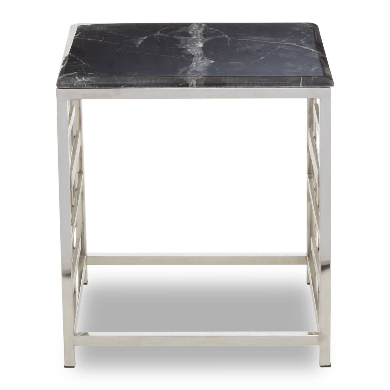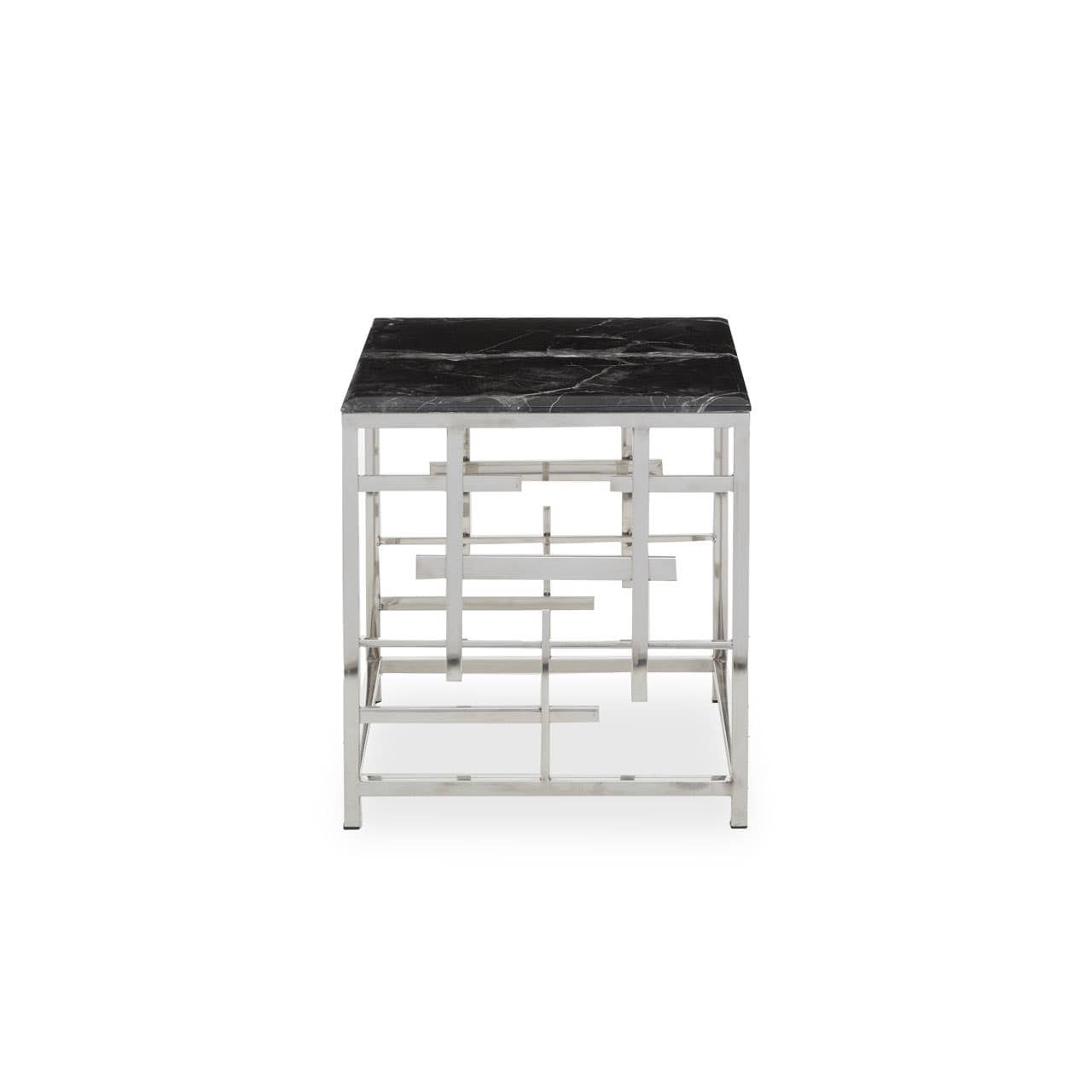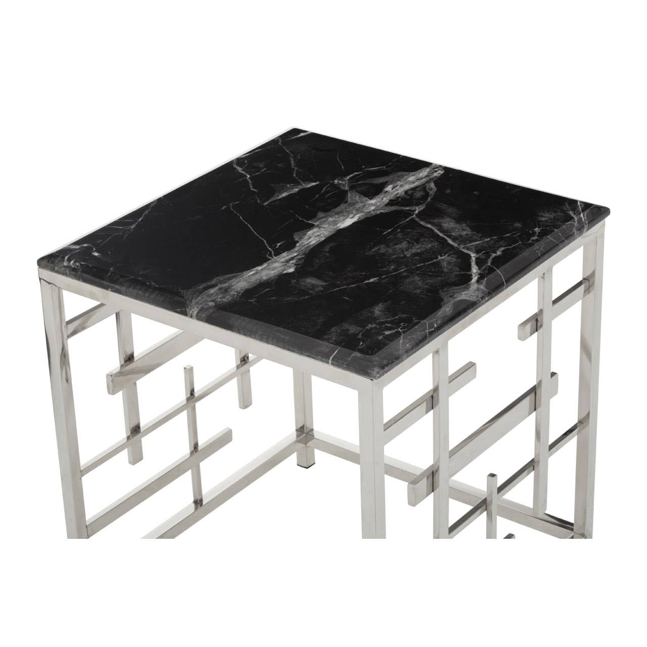 This side table features an asymmetric stainless steel base in the silver metallic finish which enhances its luxe visual aesthetic. Creating a dual contrast, a polished black marble in a square shape sits neatly on the top of this side table.