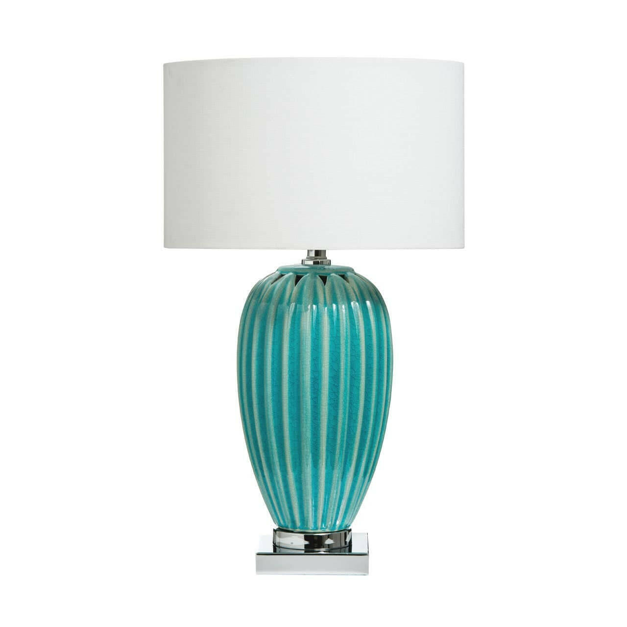 The lamp's oval body stands on a stepped base made from reflective metal. The body is formed from glazed ceramic, with close inspection rewarded as the eye is met with subtle black lines that form an intricate mosaic pattern. Its drum shade is made from white fabric, and enables the lamp to create a soft, ambient glow.